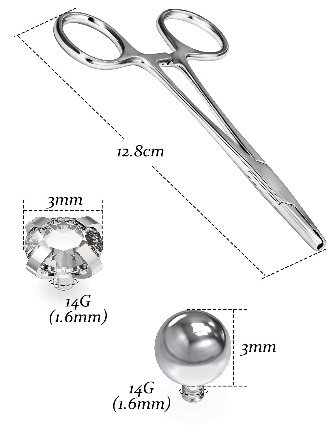 [PRODUCT SIZE]: 3MM Dermal Piercing Clamps Forceps: 125mm=4.1inch, Dermal Piercing Jewelry Ball/CZ: 14G*3mm.