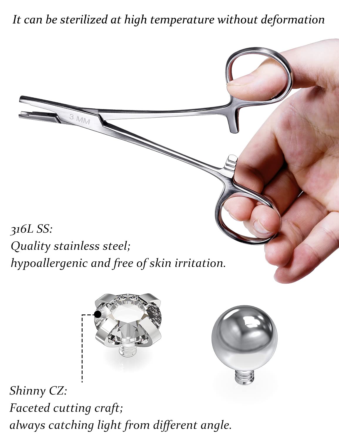 [ITEM CONTAIN]: You Will Receive 1 Pieces 3MM Dermal Piercing Clamps Forceps and 2 Pieces Dermal Piercing Jewelry Ball/CZ, All Of Them Are Beautiful And Elegant, Multiple Choices For Meeting Your Various Needs.