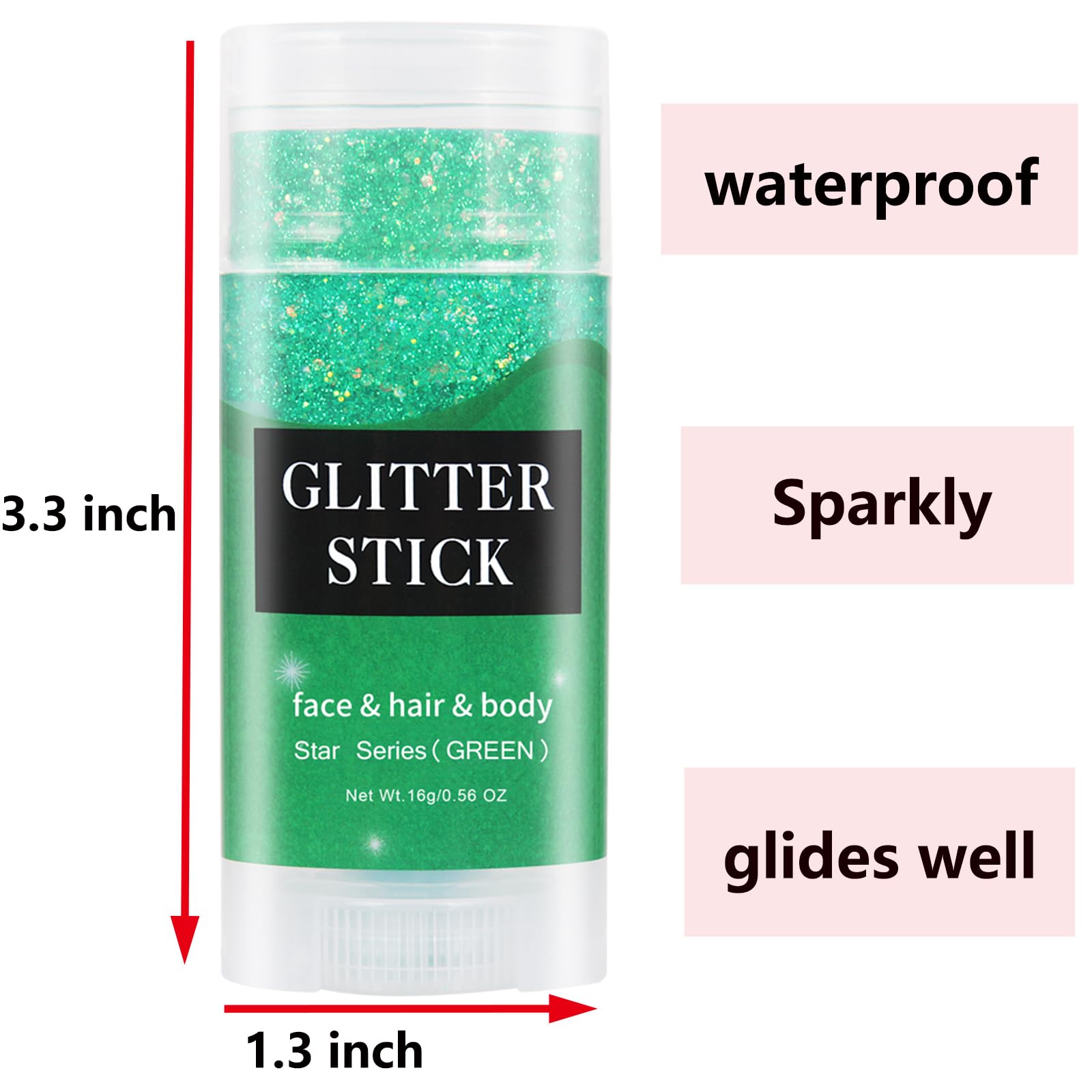 🌟Sparkly Green Glitter Makeup:MEICOLY green face glitter stick has shimmery and beautiful color with thick glitter,a little goes a long way with great shimmer shine,dry fast and no smudging,the green glitter not sticky or cracked when apply on your skin,make your night at party more sparklier,great st patricks day accessories for women.It's also great used as alien body glitter or alien hair glitter for alien makeup