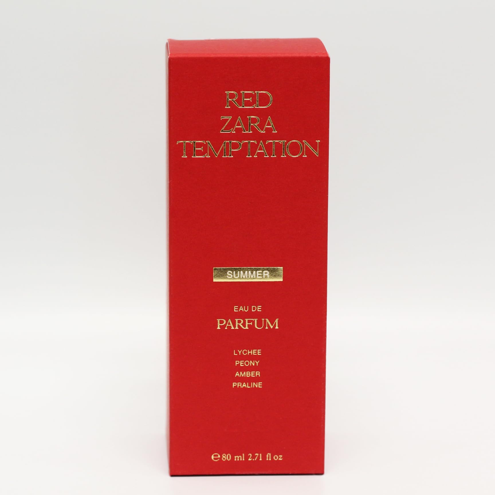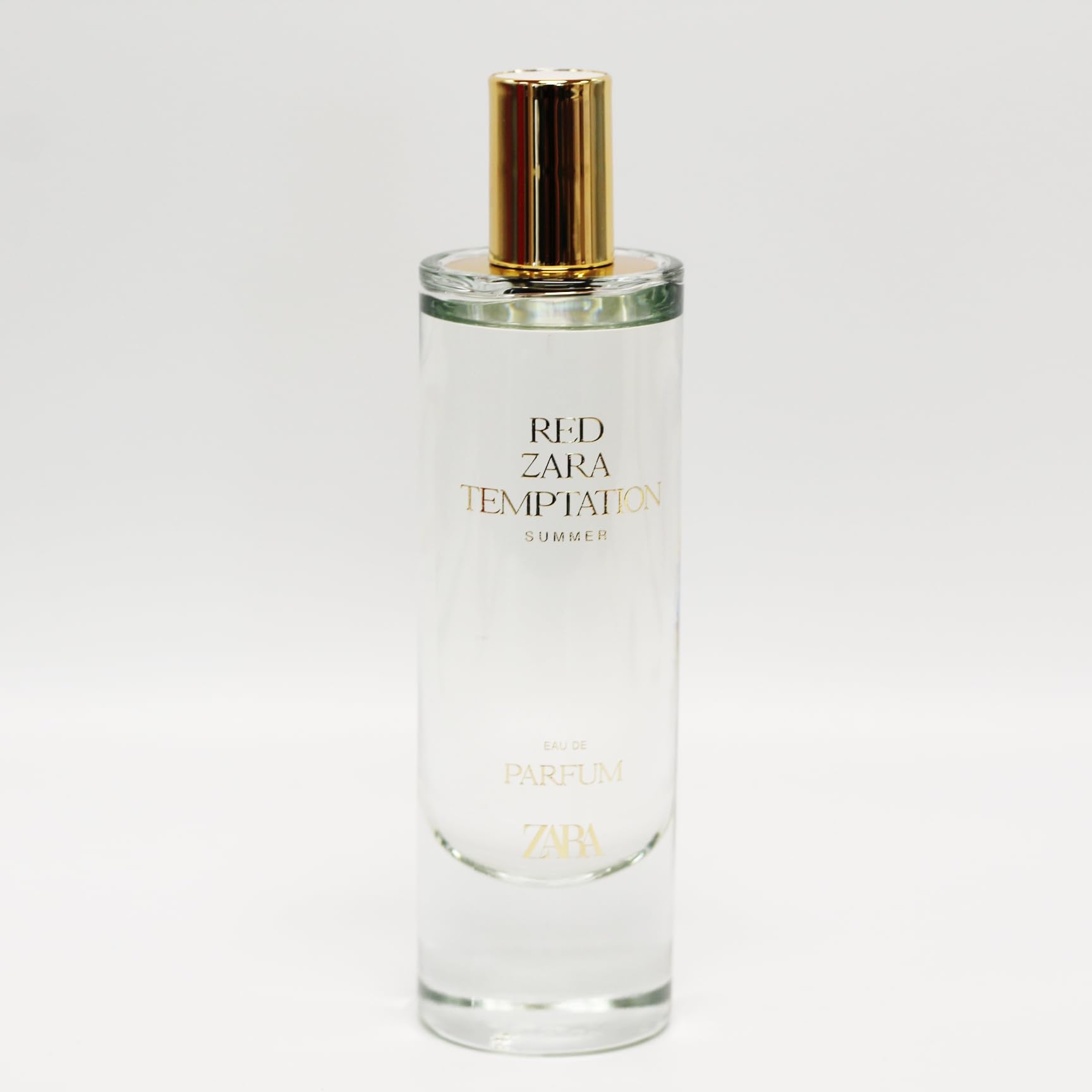 RED ZARA TEMPTATION SUMMER EDP 80 ML (2.71 FL. OZ). Eau de Parfum. Our best-selling fragrance, now in a summer version. A floral bouquet illuminated by orange blossom and jasmine, enhanced by the warm character of saffron and coriander. The sweetness of praline intertwines with woody notes, amber, and a veil of musk, leaving a feminine and addictive trail. COMPOSITION: ALCOHOL DENAT. · AQUA · PARFUM · BENZYL SALICYLATE · LIMONENE · TOCOPHERYL ACETATE · CITRONELLOL · LINALOOL Security information: KEEP OUT OF REACH OF CHILDREN AVOID APPLYING AROUND THE EYES OR ON IRRITATED SKIN FLAMMABLE. FOR EXTERNAL USE ONLY