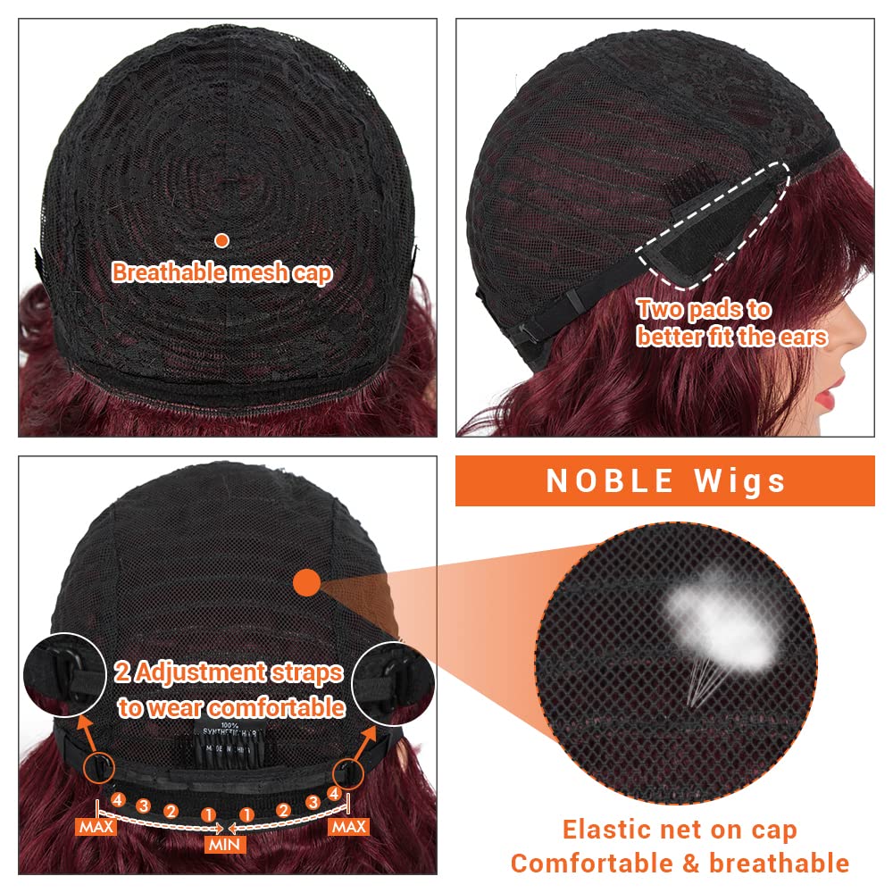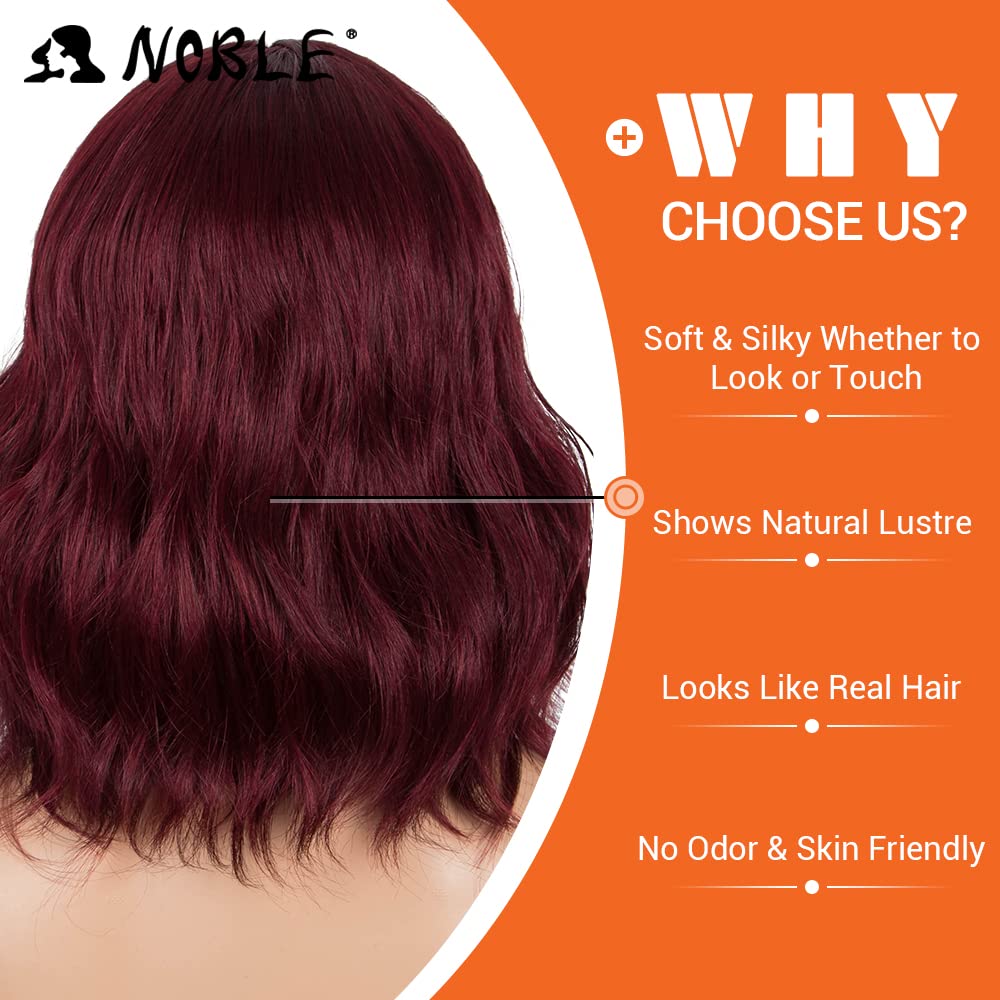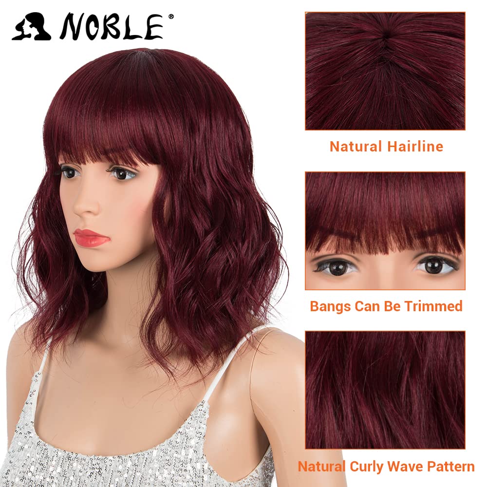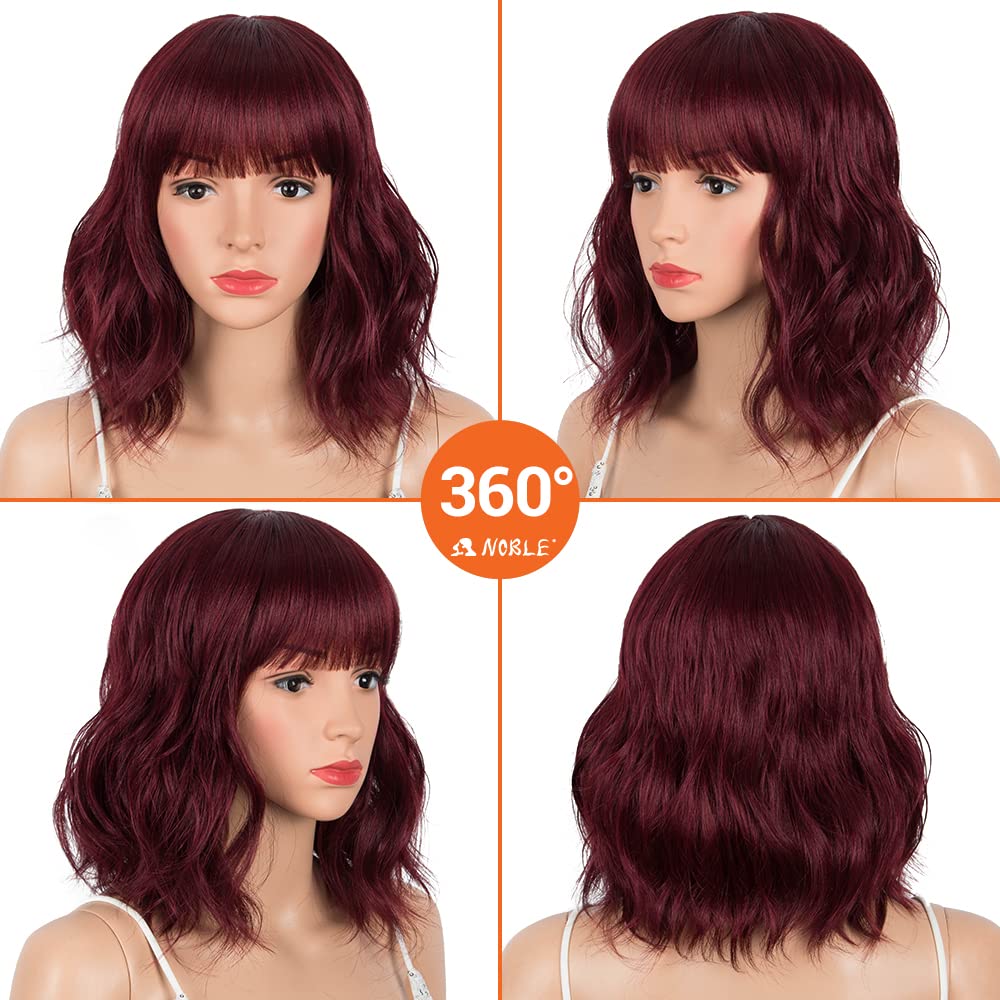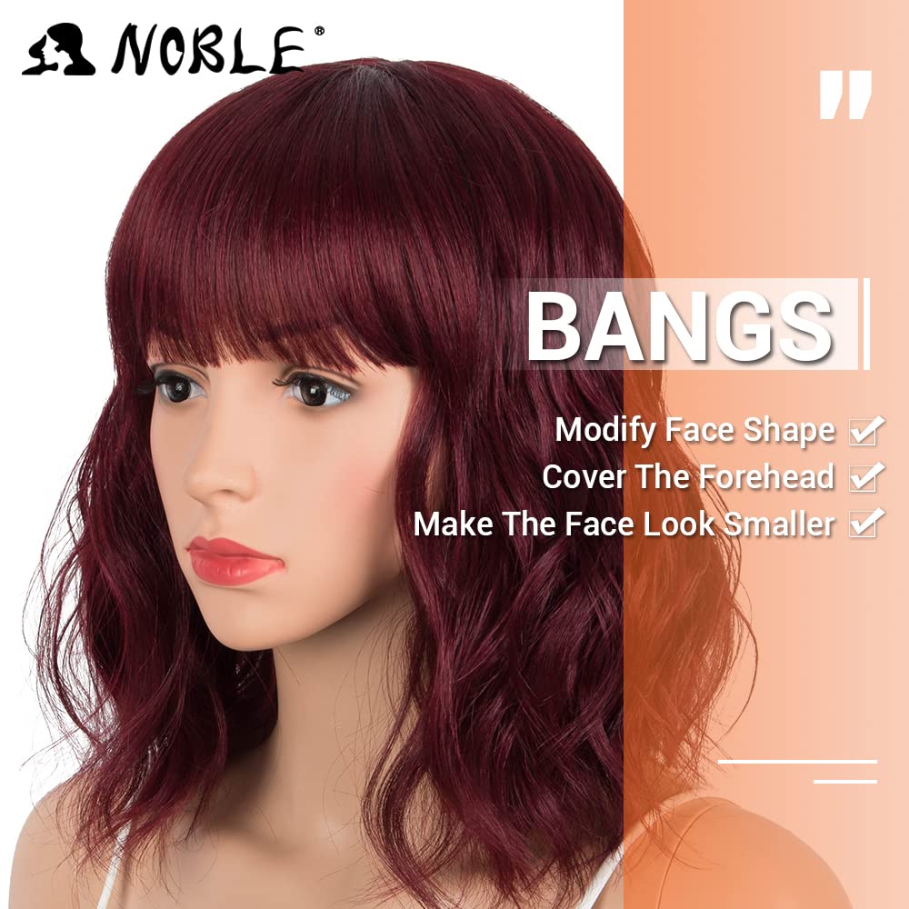 【NOBLE Short Wavy Bob Wigs with Bangs】100% high-quality heat resistant synthetic fiber, close to human hair, resilient and smooth, tangle-free, sheeding-free. Can do a few styles including pigtails, ponytail or clipping the sides behind your head.
