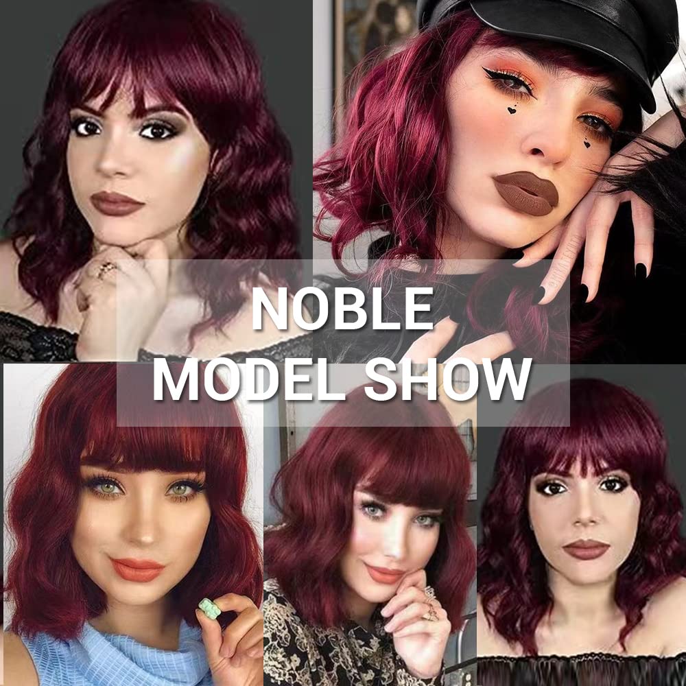 【Cute Style, Not Too Shiny, Honest Pictures】The short wine red curly bob wigs with bangs will show different feels on different face shapes. Slightly color difference due to your monitor and lighting settings which is normal. We do try our best to accurately represent colors on all of NOBLE wigs.