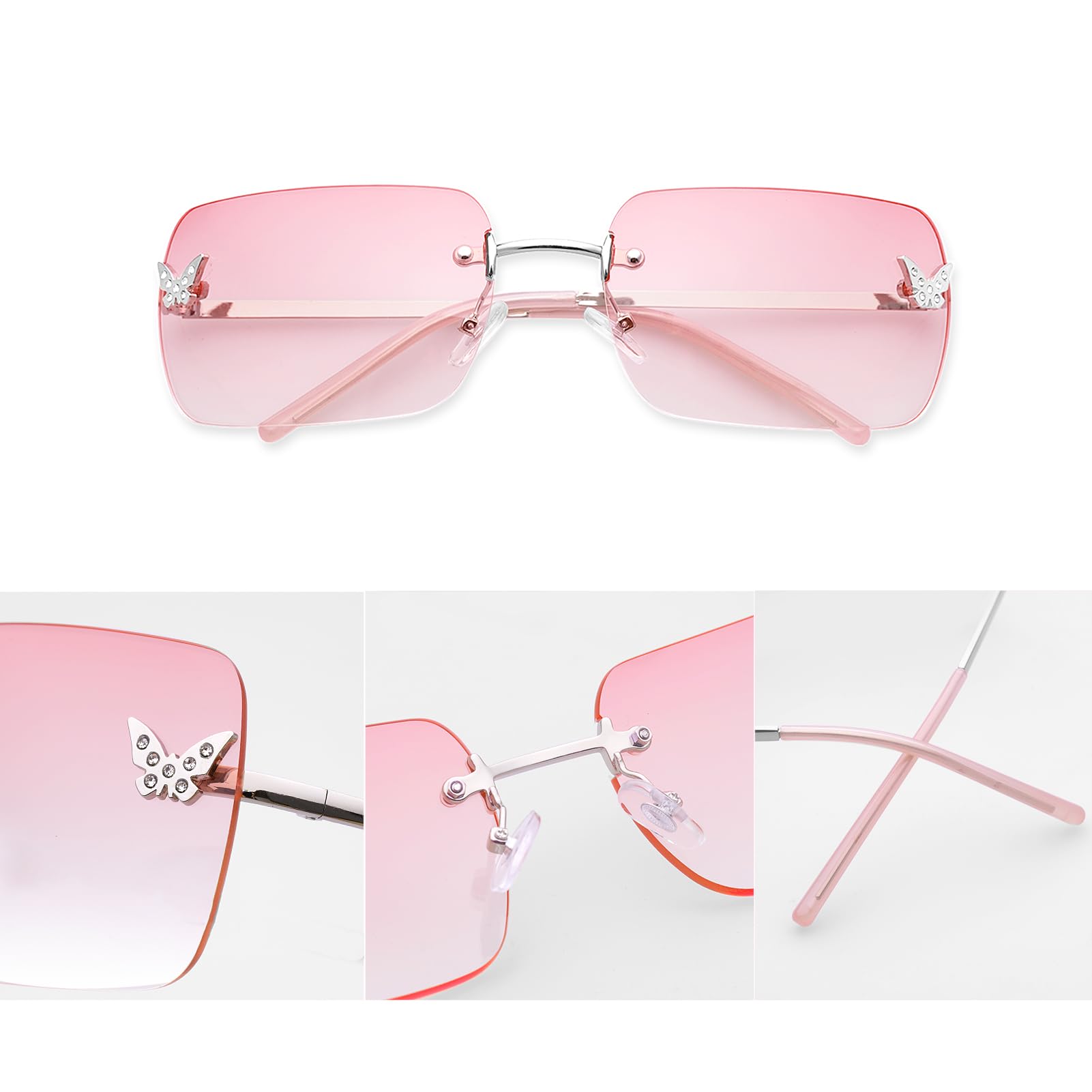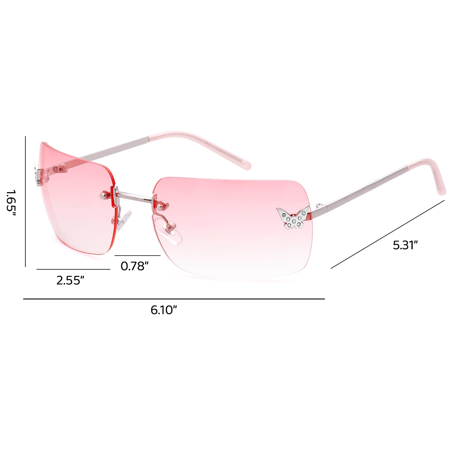 RECTANGULAR Y2K SUNGLASSES: They are not only stylish but also curved to fit greatly on your face. The frameless rectangular design enhances the beauty of the glasses, the metallic glasses legs and shiny little butterflies on the lens add a y2k touch