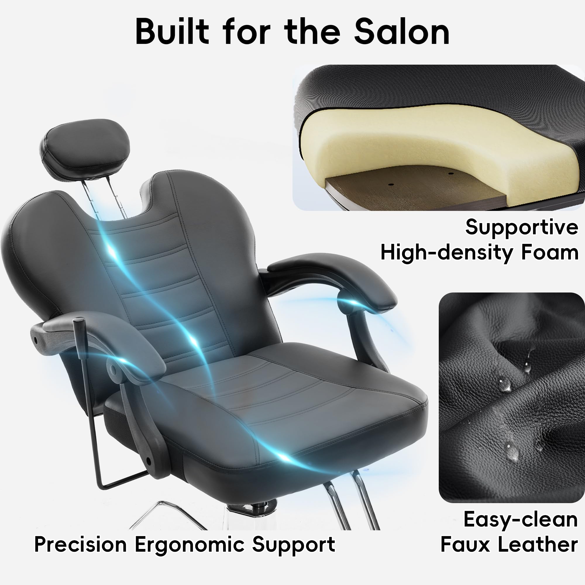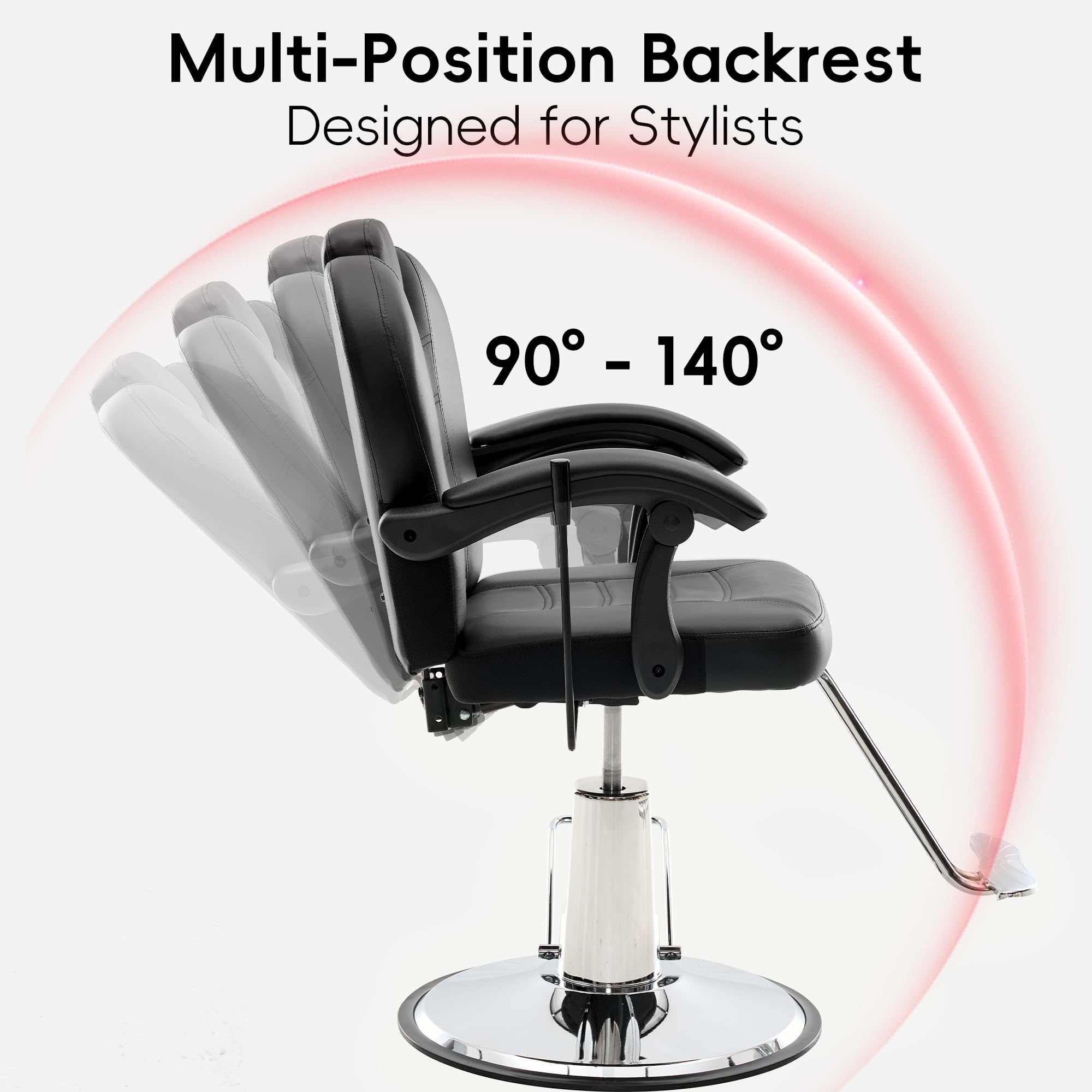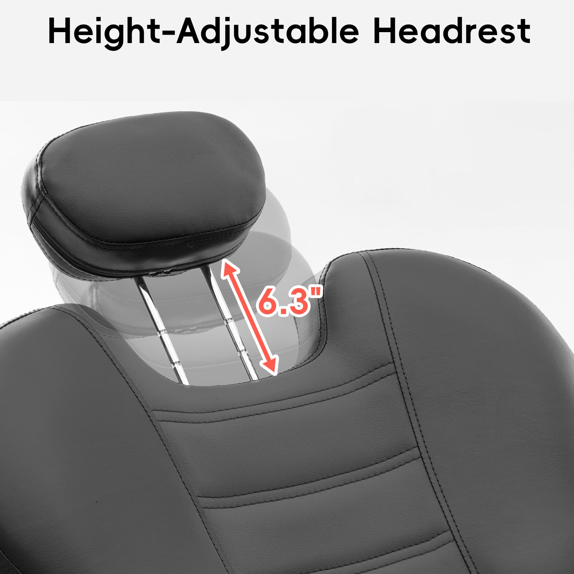 Adjustable Headrest & Backrest: Designed with an adjustable headrest and reclining backrest from 90°-140°, this reclining salon chair adapts to various client needs.