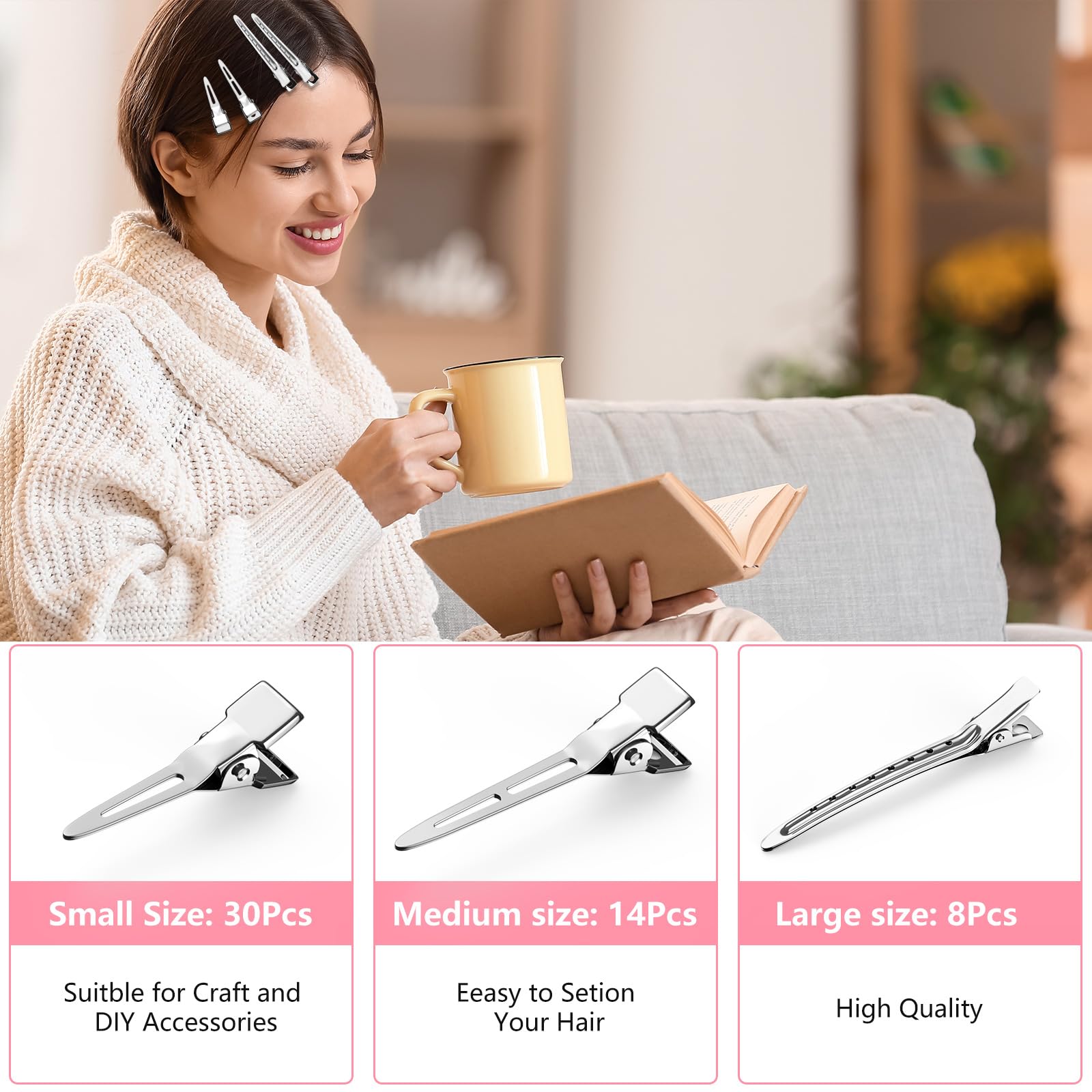 【Styling Essentials】This duck billed hair clip series is designed for perfect styling,a set of 52 hair clips:Including 8 large ones,14 medium ones, and 30 small ones.Lightweight hair clips can effortlessly manage fine hair,while flat hair clips can seamlessly blend into any hairstyle. A sufficient number of hair clips can be used for cutting sewing projects, making bow hair clips, and other DIY accessories
