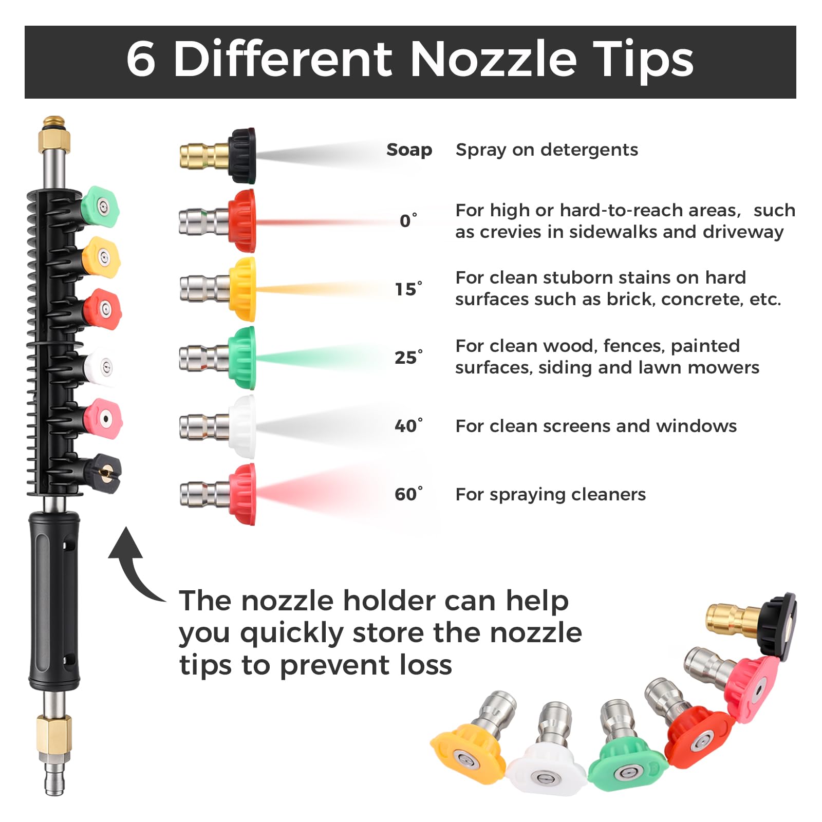 Easy to Use: This pressure washer wand is very easy to use. It can be easily assembled without any tools. The bottom of the pressure washer gun can be directly connected to a hose with an M22-14mm inner diameter interface. Or connect a hose with an M22-15mm inner diameter interface through an fittings. At the same time, this pressure washer gun is equipped with 6pcs different angles nozzles tips. You can use different nozzle tips in different scenarios.
