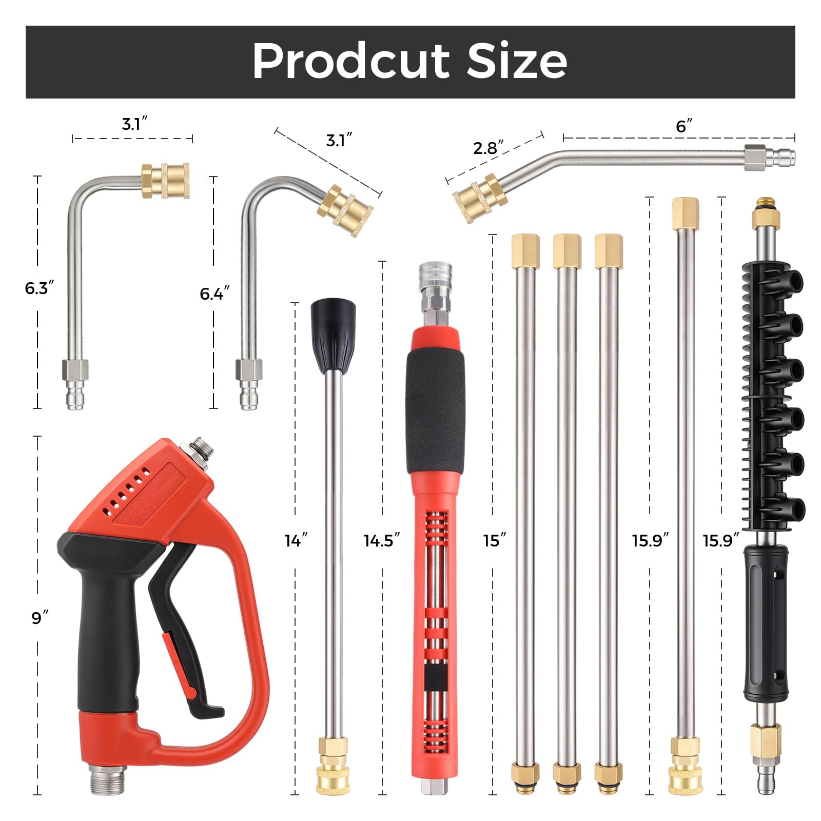 Multiple Extension Wands: This pressure washer gun comes with 7 straight extension wands and 3 curved extension wands. The size of the pressure washer gun is 9”, which can be up to 122"/10.17ft by connecting the extension wands, allowing you to easily complete cleaning projects at various heights without ladders or scaffolding. The curved extension wands contain three angles, 30°, 60° and 90°, which are very suitable for cleaning narrow such as gutters and roofs.