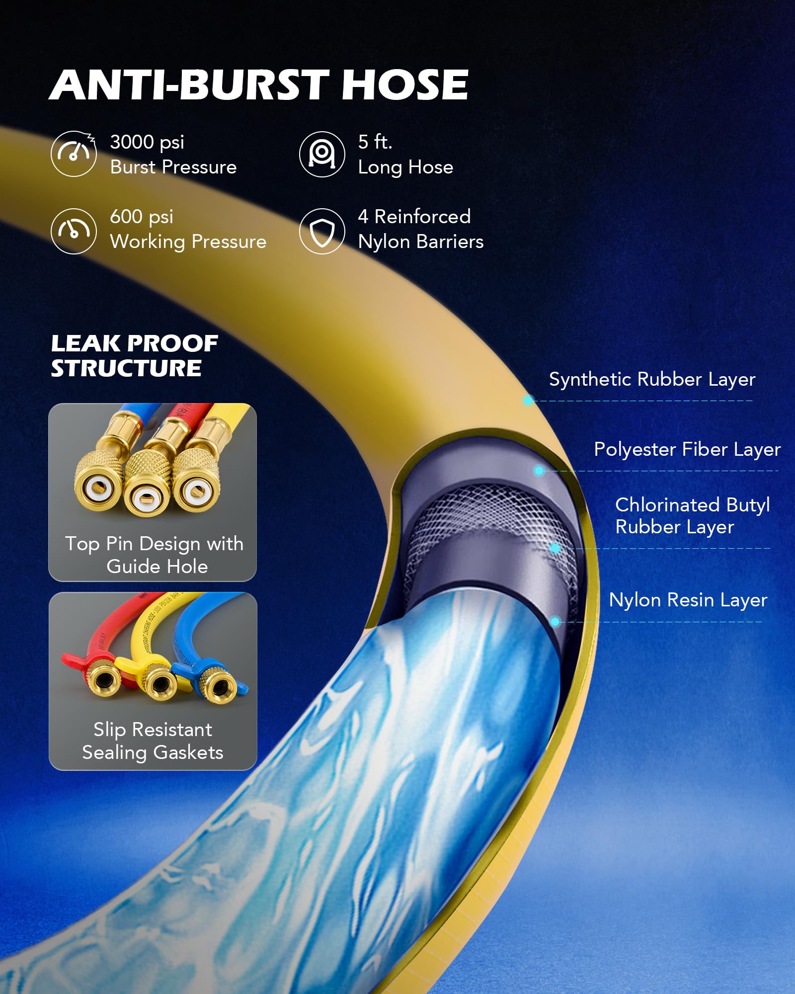 COLOR-CODED HOSES: Blue for low, red for high, and yellow for charging, these PVC hoses have 4 reinforced layers to work with daily pressure up to 600 psi (3000 psi burst pressure)