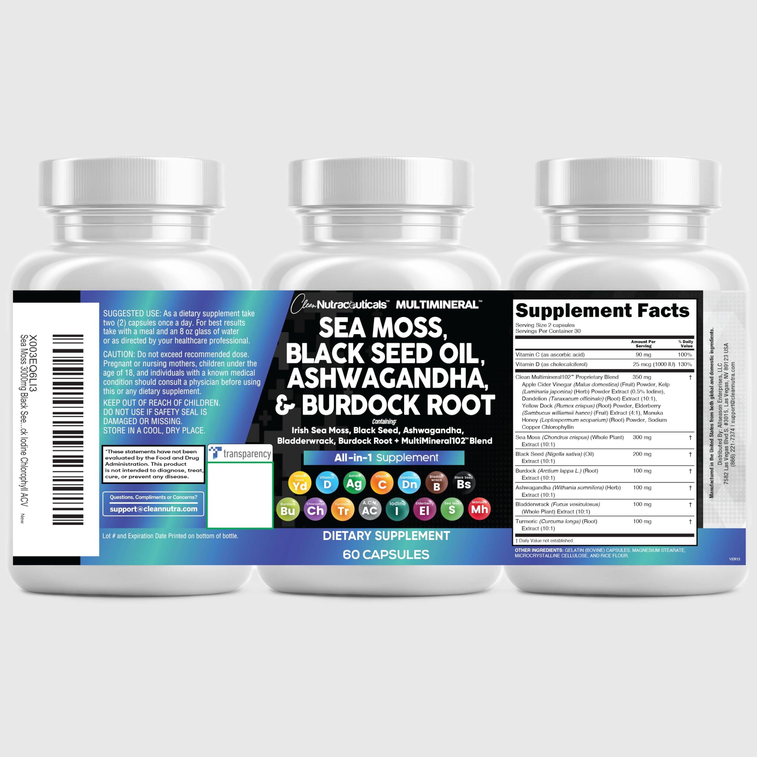 A Powerful All In One Supplement - Clean MultiMineral is overflowing with potent Sea Moss Supplement, Black Seed Oil capsules, Aswagandhada capsules, Burdock Root, Bladderwrack and turmeric powder. Clear out those countless supplements in your supplement cabinet, and replace it with just one seamoss powder, black seeds oil, aswagandhada capsules, and burdock supplement 15-in-1 formula from Clean Nutraceuticals. We made Irish seamoss bladderwrack burdock capsules better by adding black seed.
