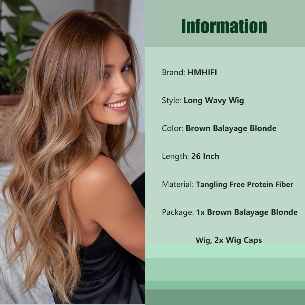 Long Brown Balayage Blonde Wigs for Women 26inch Wavy Curly Wig Natural Looking Middle Part Synthetic Heat Resistant Hair Replacement Wigs for Daily
