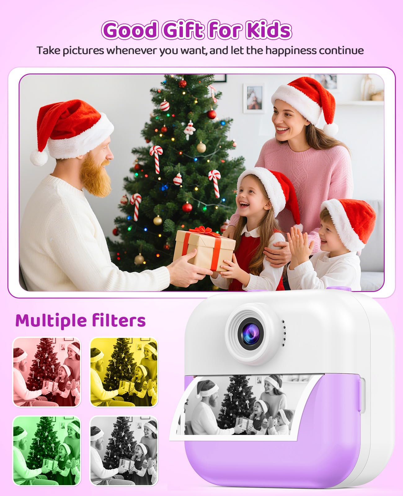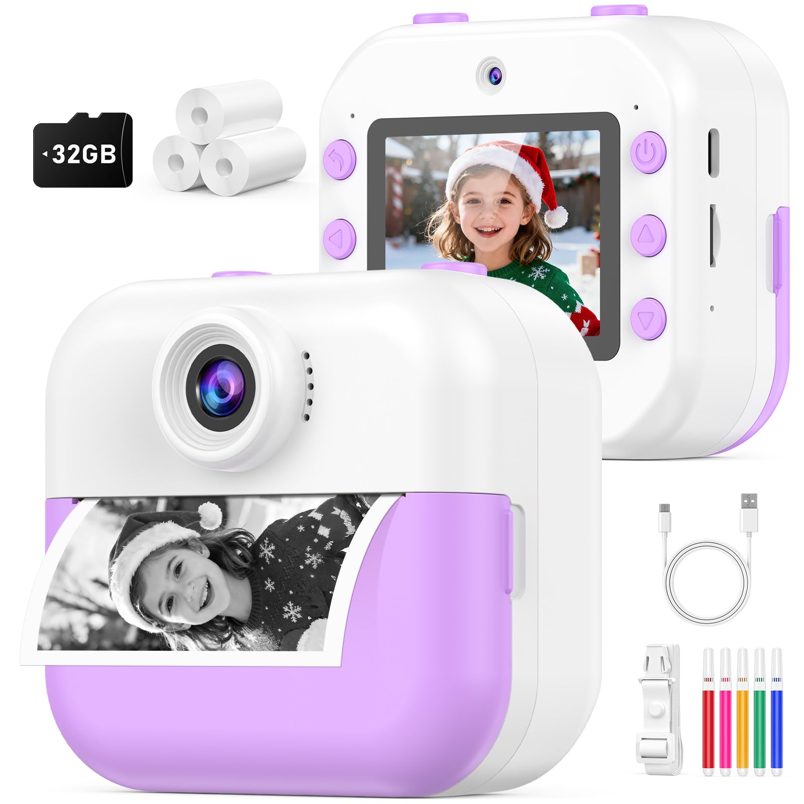 Quick-Release Prints for Kids:This creative camera prints black & white photos in just 1 second while saving color versions to the included 32GB memory card. Children can personalize their shots with 15 fun filters and 16 cute stickers. The thermal printing technology requires no messy ink - simply load the included paper rolls (372 sheets included!) for endless creative play.