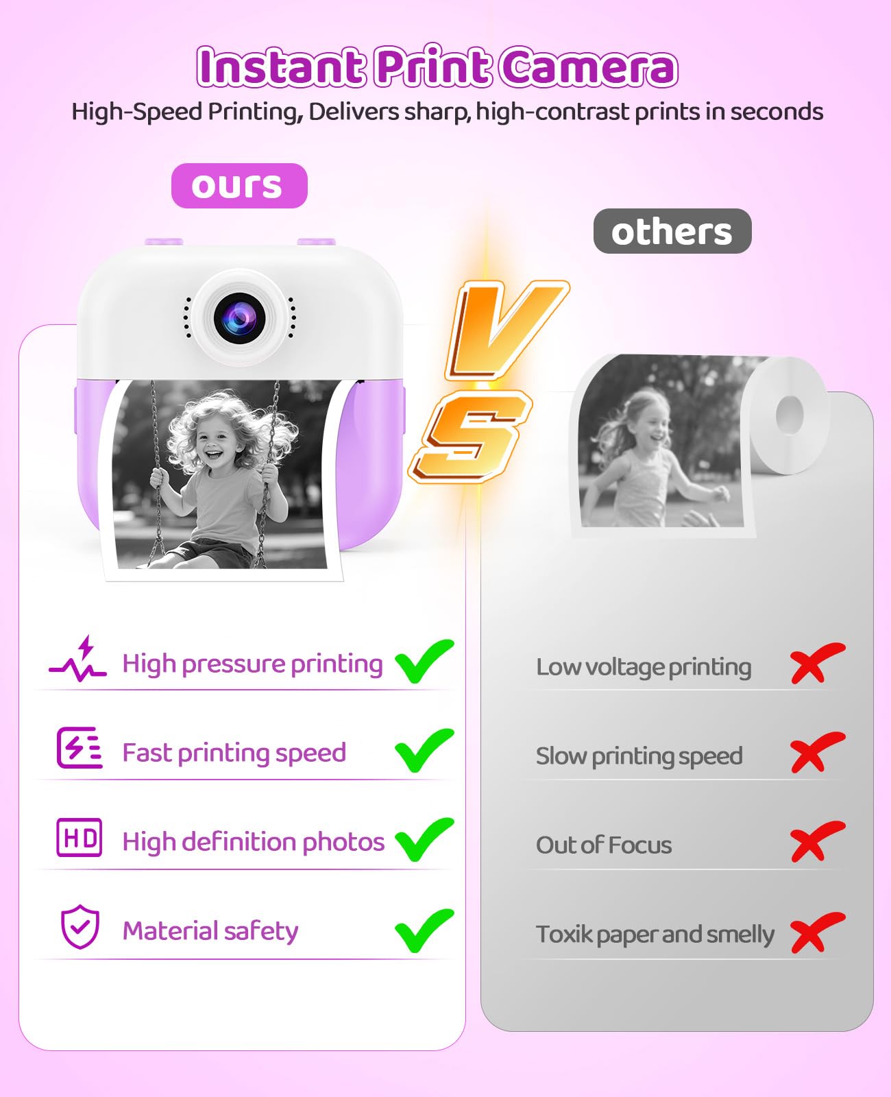 Safe & Durable Design:Our child-friendly camera uses completely safe thermal printing technology (BPA-free, no ink or powder required). The durable, drop-resistant body is specially designed for small hands. Complies with all U.S. toy safety standards for worry-free play.
