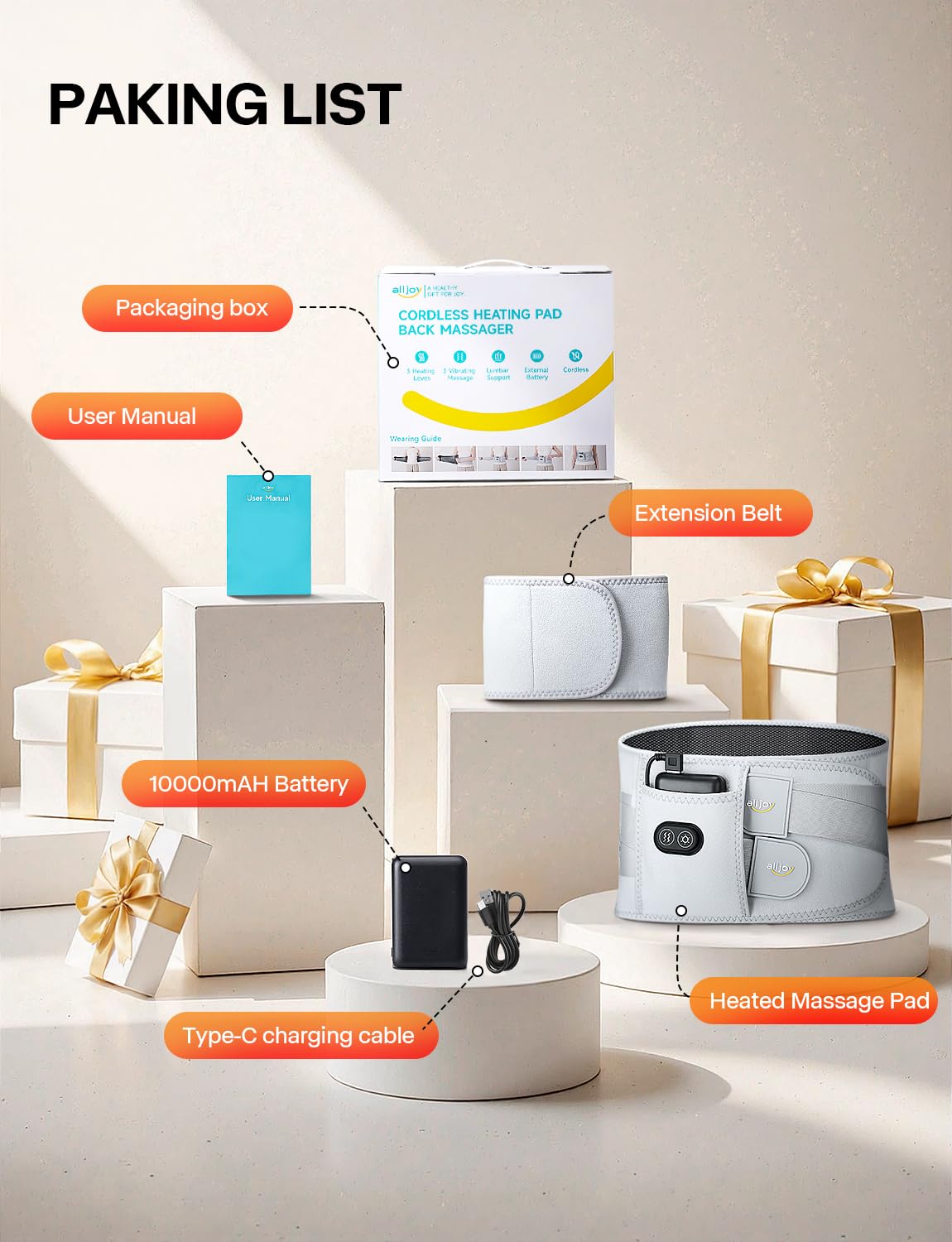 【10000mAh BATTERY CORDLESS & PORTABLE】ALLJOY portable heating pad is 10000mAh battery operated (included). It's not to be tied down to a power cord anymore. Use it freely when doing housework, driving a car, or working on the computer. This heating belt runs for 5 hours on a single charge when both heating and vibration sets to the lowest settings simultaneously.