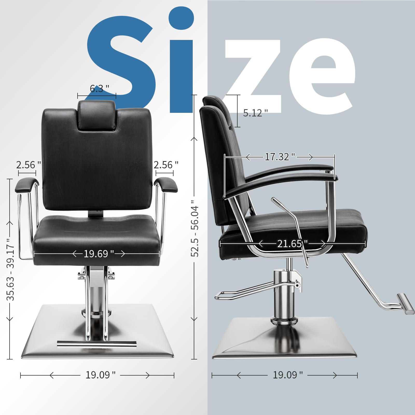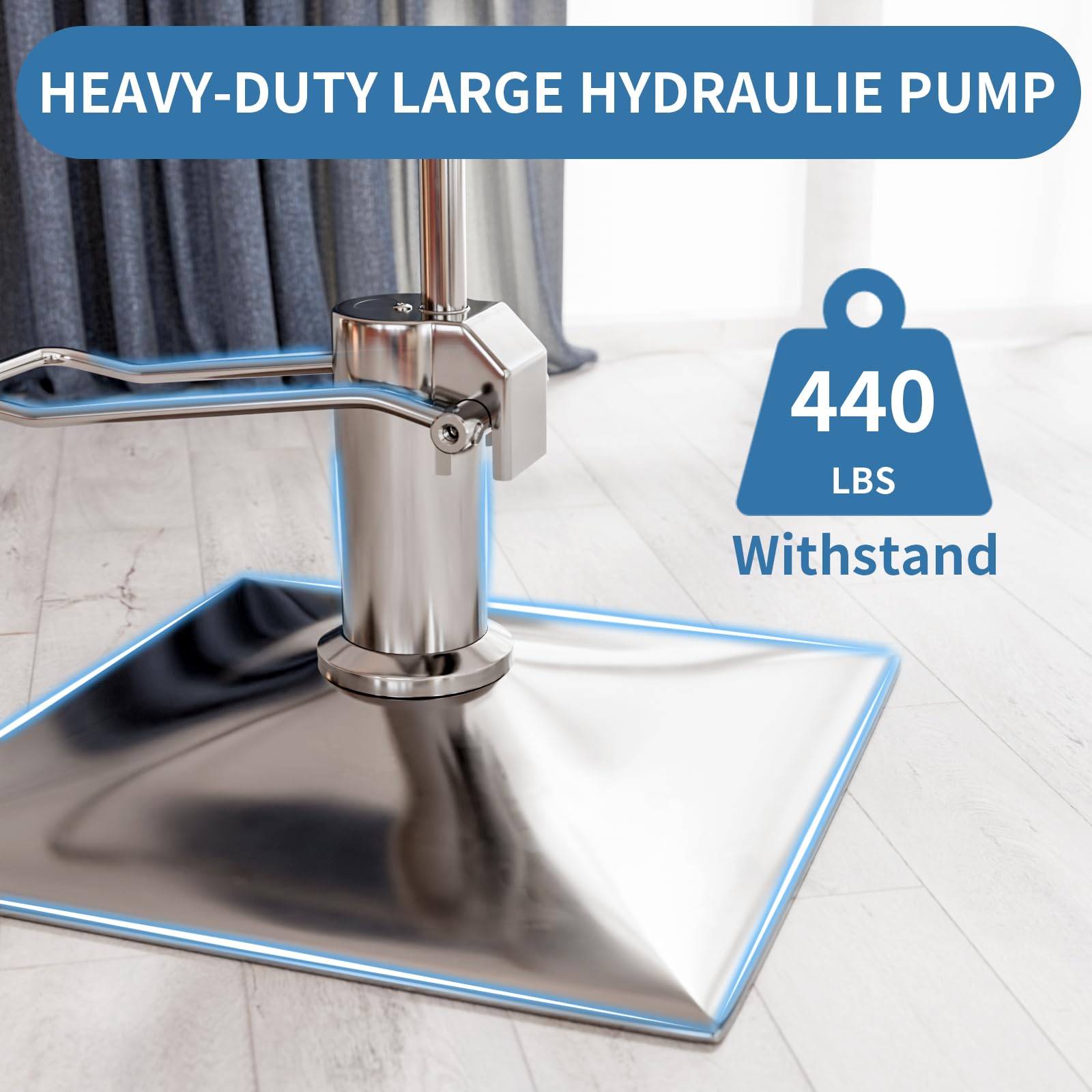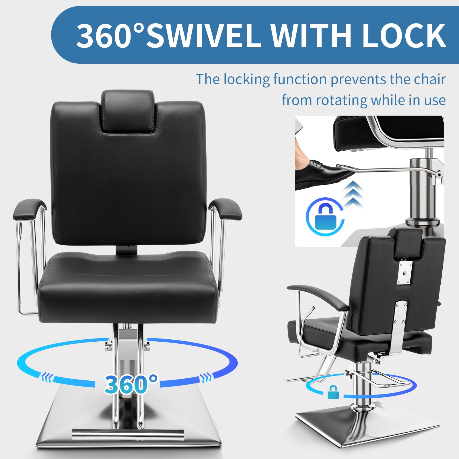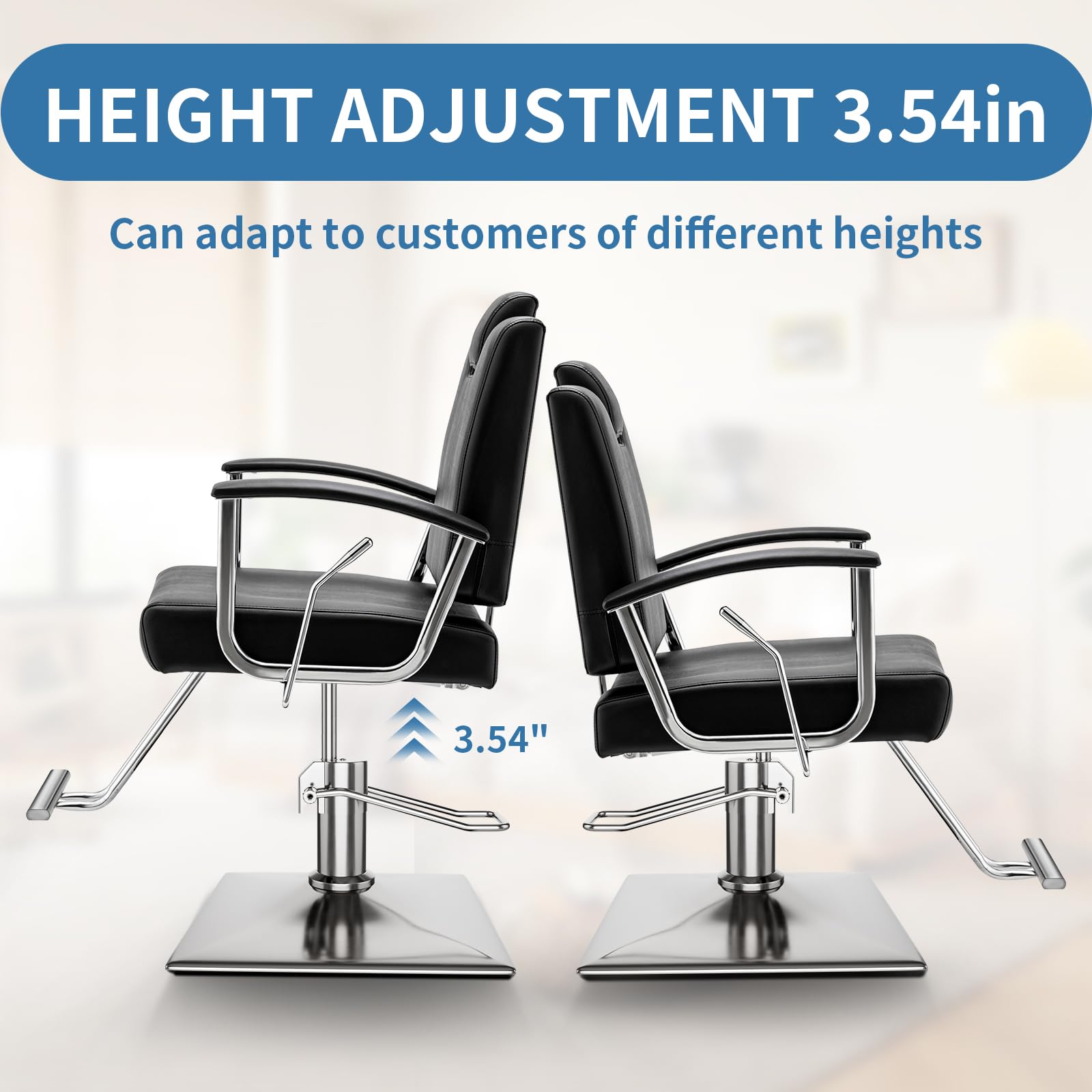 MULTIFUNCTIONAL ADJUSTMENT - By gently stepping on the lift lever to discharge the air in the hydraulic pump, the barber chair can be adjusted to a height of 3.54 inches to reduce the stylist's fatigue of bending down to work, 360° swivel function is convenient for the stylist to perform multi-angle operation to enhance the efficiency of the work, and it can be fixed in place after swivel to avoid accidental sliding and ensure safety.