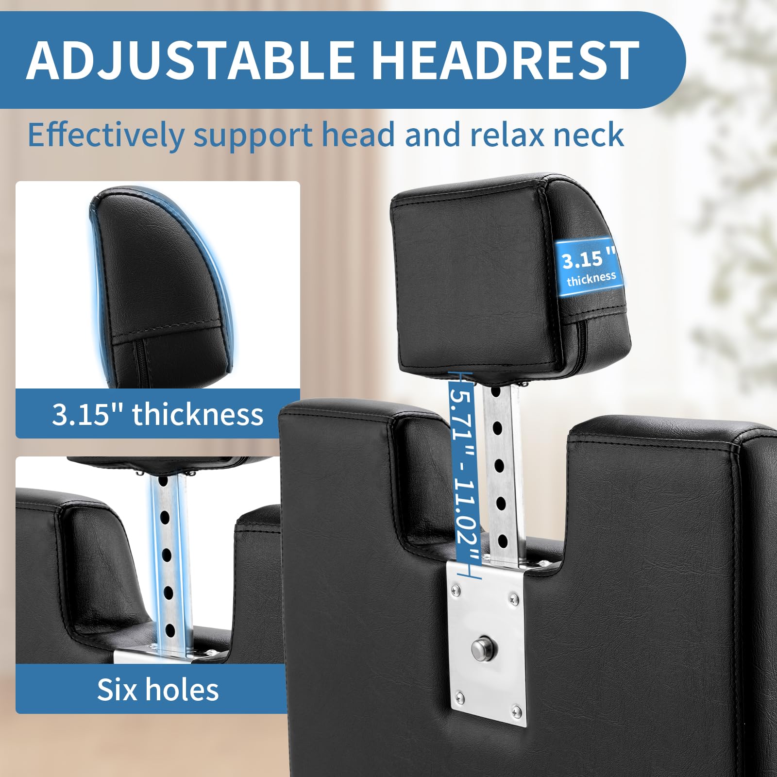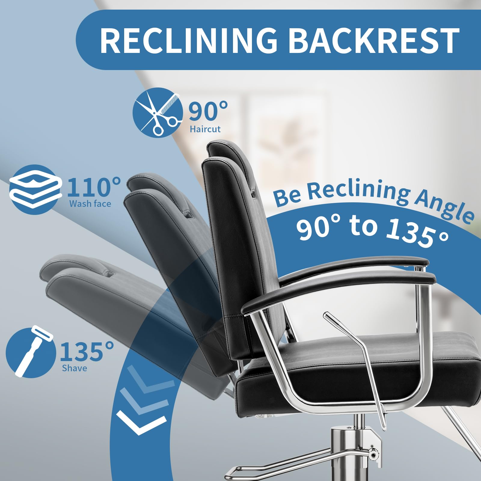 ADJUSTABLE COMFORT - This salon chair has adjustable backrest and headrest, the backrest supports 90°-135° free tilt and can be easily operated by the pull bar to meet different scenarios, the headrest is removable and can be lifted and lowered by 5.31 inches to accurately support the neck, adapting to the different heights of the customers, which not only enhances the comfort of the customers, but also improves the flexibility of use.