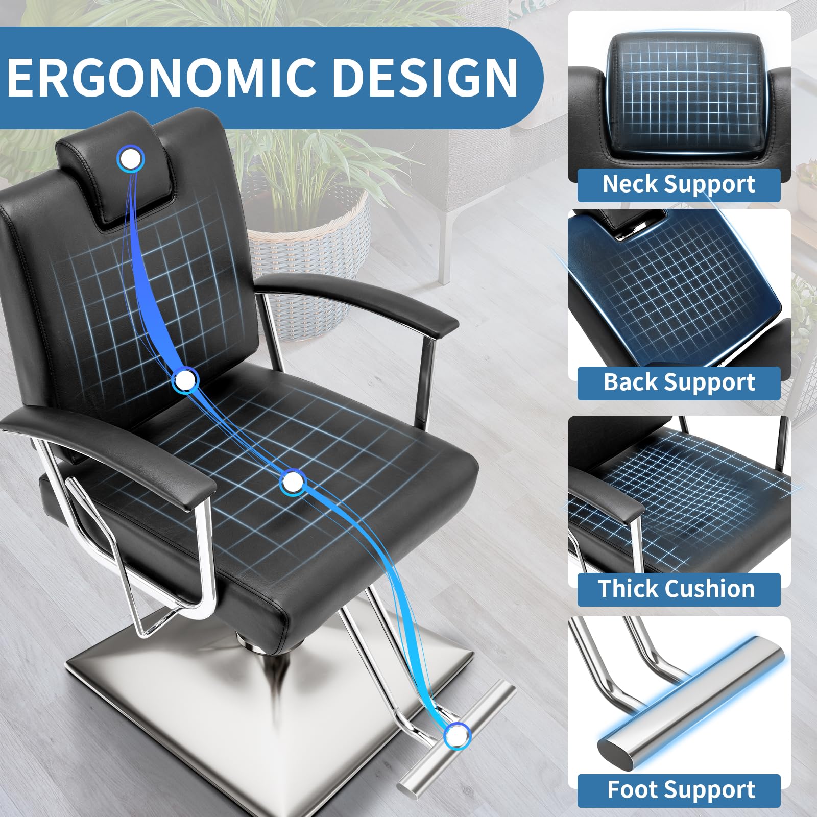 HEAVY DUTY HAIR SALON CHAIR - This high quality salon chair for hair stylist is equipped with heavy duty hydraulic pump and base, sturdy and durable, not easy to shake when using, with strong stability, the barber chairs for barbershop can provide up to 440lbs of weight support, to meet the needs of customers of different sizes.