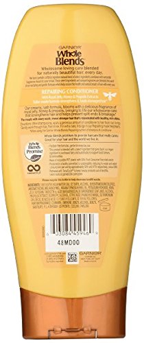 Our creamy, lush repairing conditioner, blooms with a delicious fragrance of royal jelly, honey & propolis, bringing to life our wholesome care for damaged hair that strengthens and helps prevent split ends & breakage. When using the Garnier Whole Blends Repairing system of shampoo & conditioner. • Strengthens and heals damage • Tailor-made formula with royal jelly, honey, and propolis extracts helps prevent split ends and breakage • Enriched with a Natural Blend, Paraben-Free • Gentle for everyday use After shampooing, apply a generous amount of conditioner to hair from root to tip. Gently work through hair, then rinse. For extra care, indulge in our Repairing mask treatment.