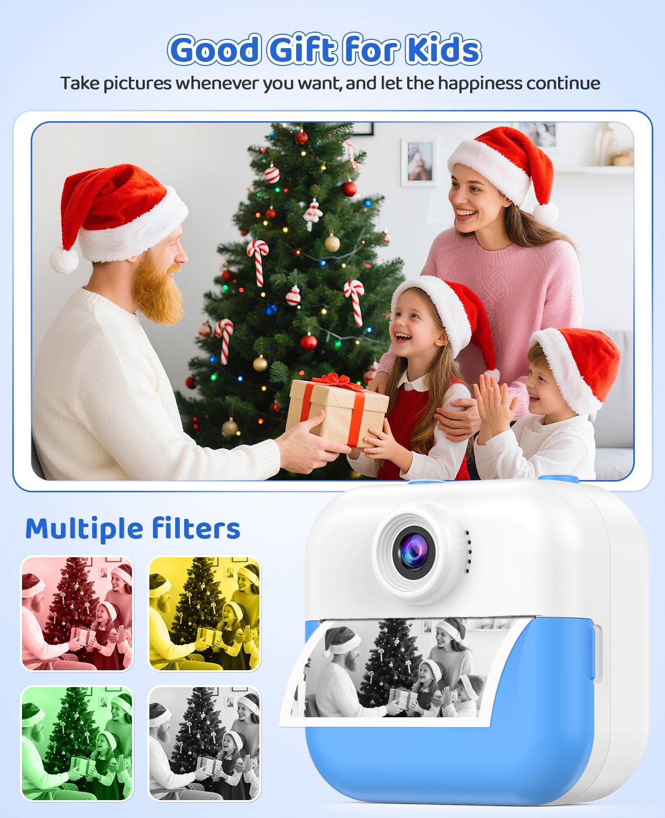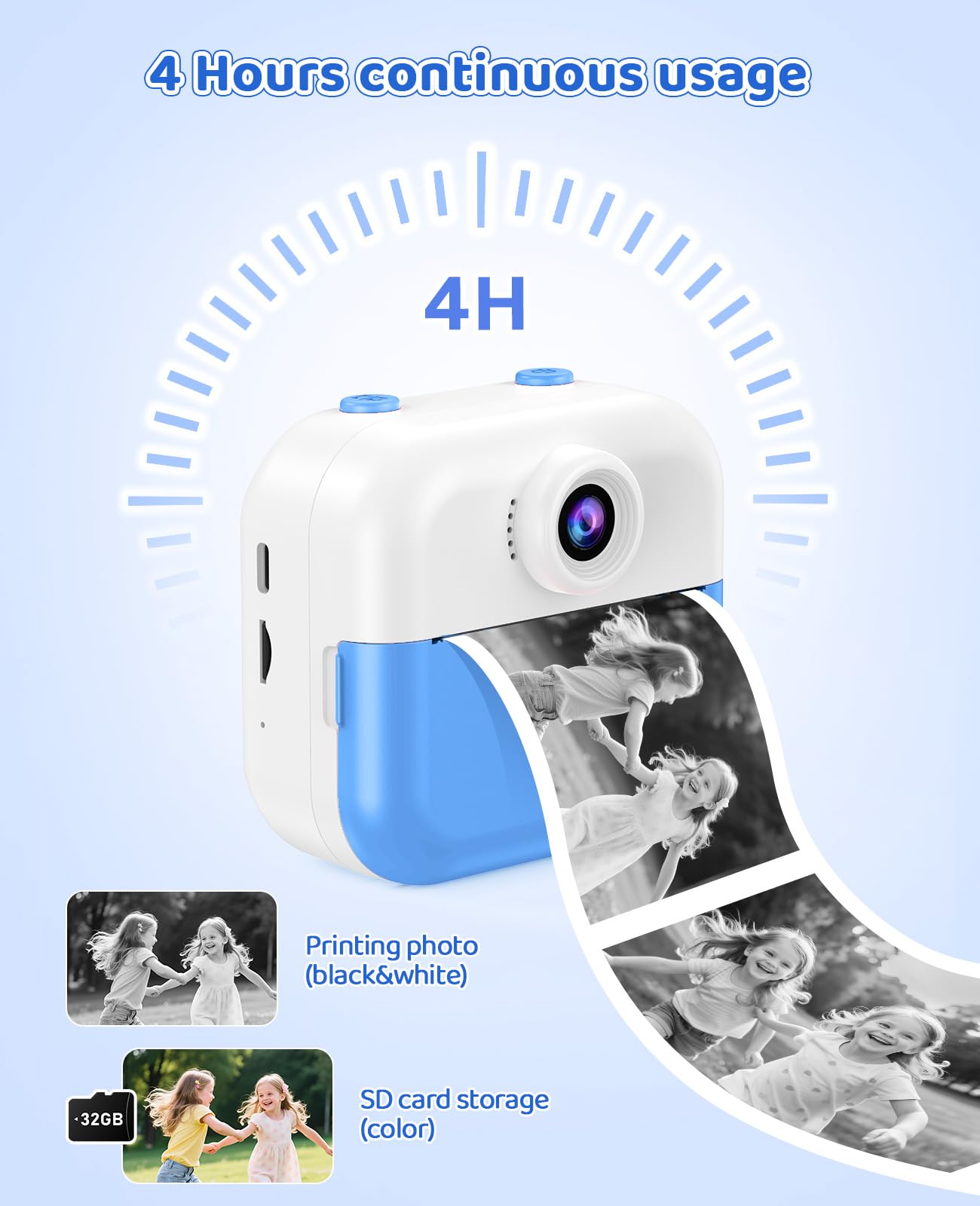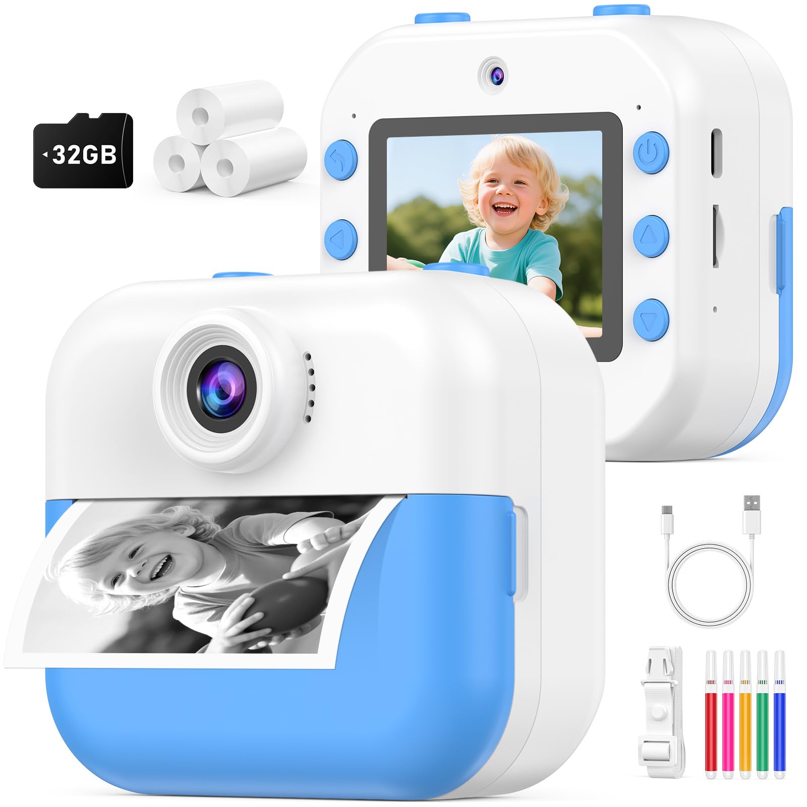 Instant Print Camera for Kids:This creative camera prints black & white photos in just 1 second while saving color versions to the included 32GB memory card. Children can personalize their shots with 15 fun filters and 16 cute stickers. The thermal printing technology requires no messy ink - simply load the included paper rolls (372 sheets included!) for endless creative play.