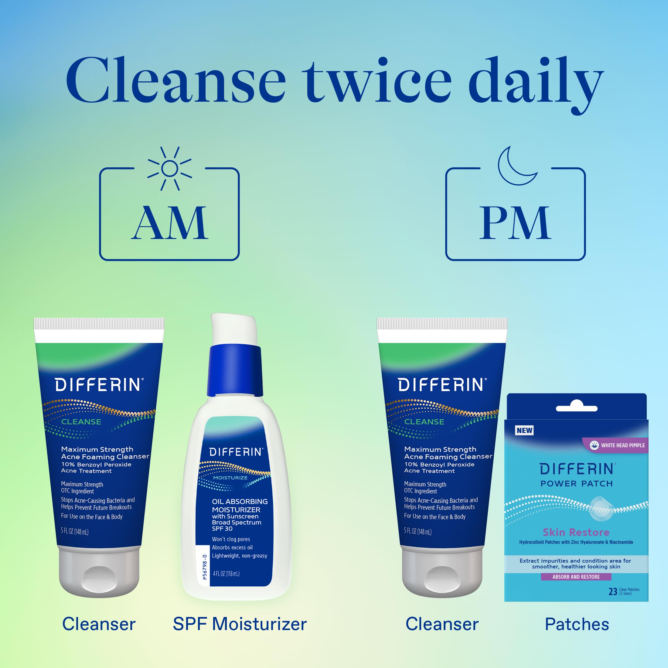 Differin Maximum Strength Acne Foaming Cleanser is a cream to foam acne face wash and body wash designed specifically for acne-prone skin. Formulated with 10% benzoyl peroxide (BPO), the strongest OTC strength concentration without a prescription, it starts working immediately to help clear acne while also preventing future breakouts. This dual-action formula acne wash can be used for face and all over body, including chest and back, helping you target and cleanse acne breakouts where they can pop up most. Micronized benzoyl peroxide penetrates into the skin to eliminate most acne-causing bacteria, resulting in longer-lasting clearer skin, and has shown to be less irritating than traditional non-micronized benzoyl peroxide formulas. Use as a part of your daily cleansing routine to assist with acne treatment. Apply to wet skin and gently massage for about 20-30 seconds, avoiding the eye area. Rinse the facial cleanser and body cleanser thoroughly and pat dry for best results. Start with one application daily and gradually increase to two or three times a day as needed.