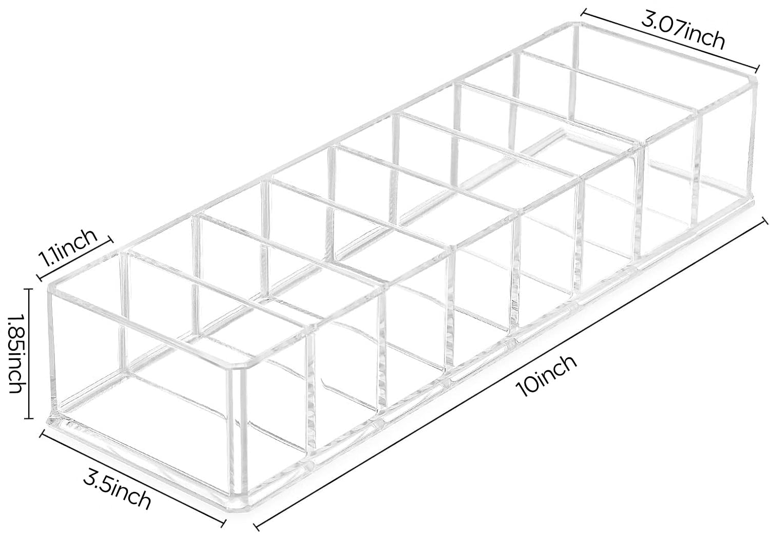 SIZE: 10x3.5x1.85 inches(25.4x8.9x4.7cm). Each inner cube measures 3.07x1.1inches(7.8x2.8cm). Features 8 separate compartments, this holds approximately 3 bullet lipsticks per slot, one small eyeshadow palette or blush/bronzer per slot. That are perfect for use on the countertop.