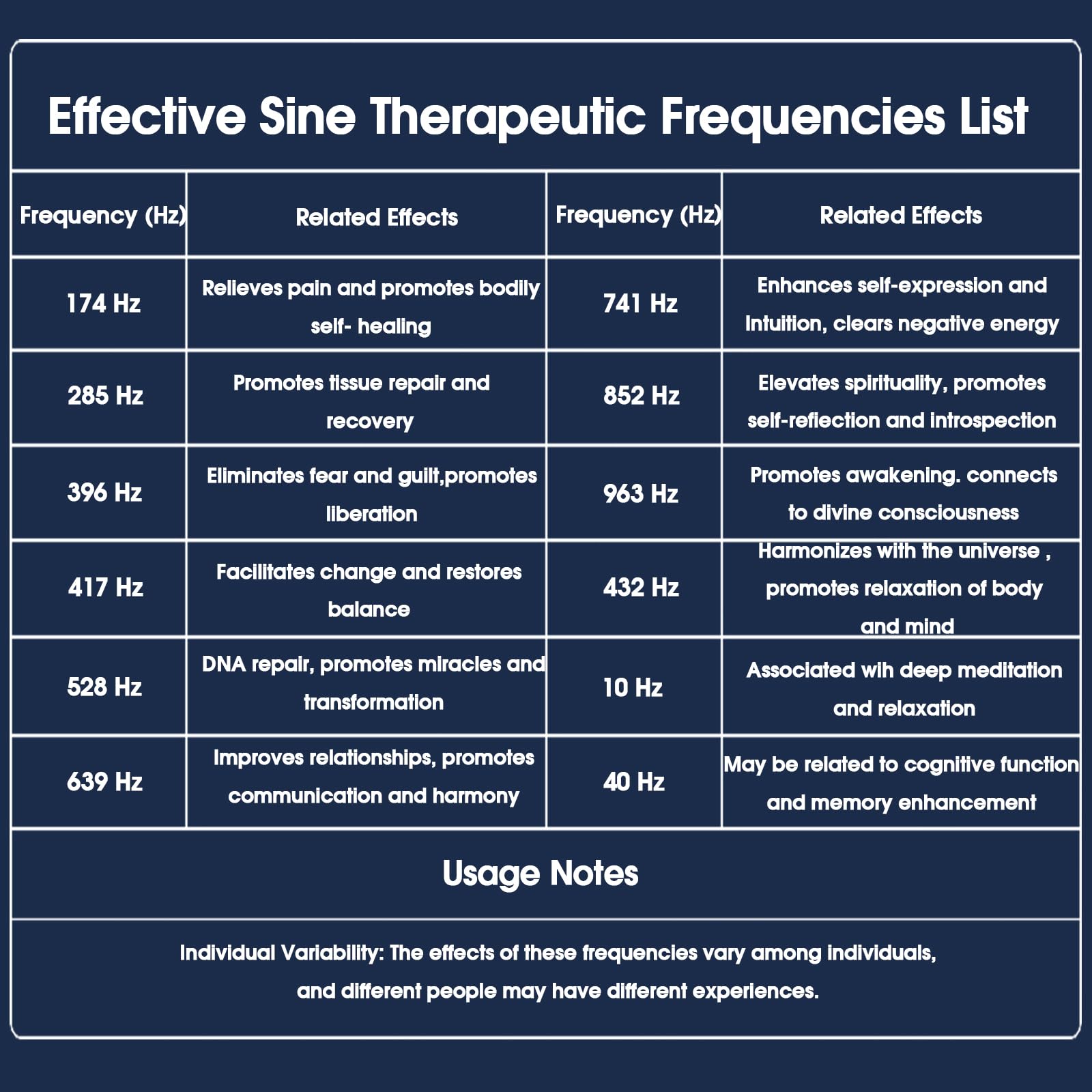 【Purchase with Confidence】We provide 24-hour customer support. For other frequency benefits, refer to the Effective Sine Therapeutic Frequencies List. Note: Consult professionals before using sound or music therapy to ensure it's appropriate for your health and needs.