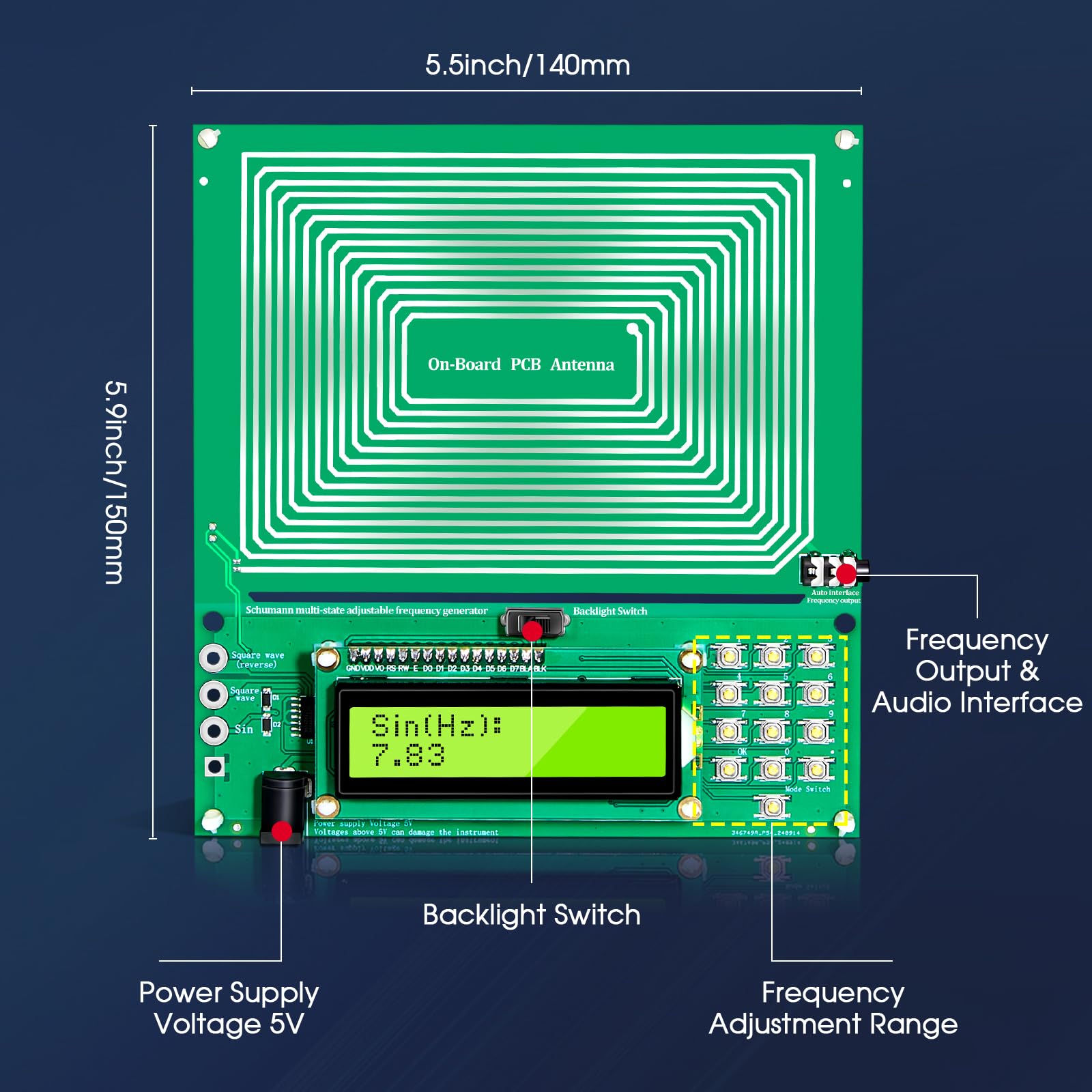 【Durable & Energy-Efficient Design】The Schumann resonance generator is made from durable ABS material, consumes less than 1W of power, and is equipped with both a DC5.5 * 2.1 power interface and USB power option. It supports multiple waveform outputs and measures 5.51 x 5.91 inches, with a package weight of 0.4 pounds.