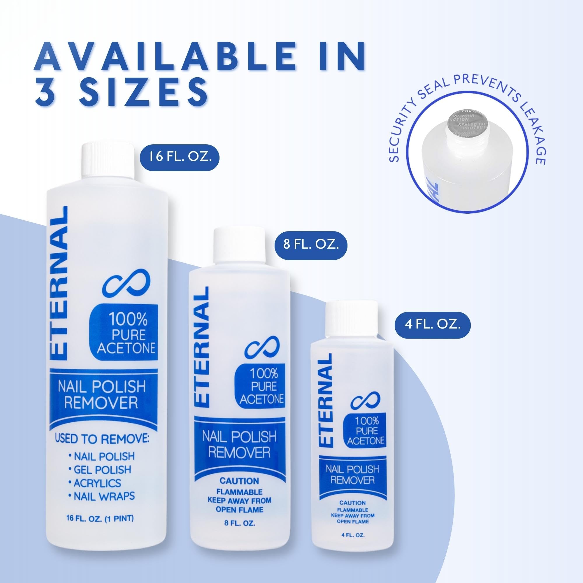 EXPERIENCE SALON-QUALITY RESULTS: Achieve professional manicure and pedicure results at home with Eternal 100% Pure Acetone Nail Polish Remover. Say goodbye to stubborn and tough glitter, gel, acrylic or any nail polish, and leave your nails ready in record time!