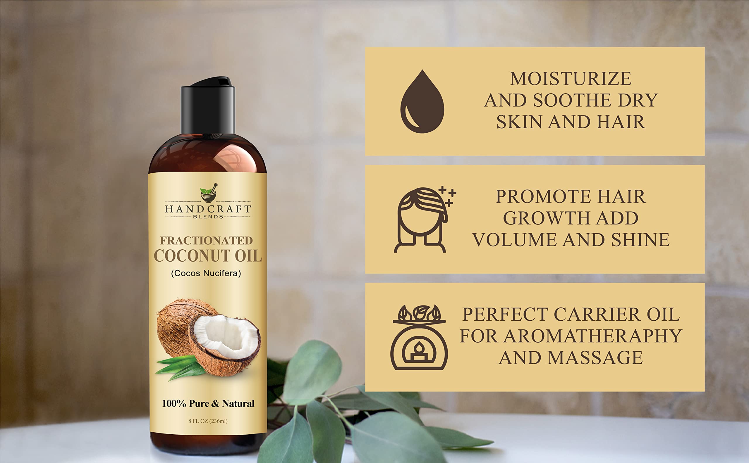 100% PURE & NATURAL FRACTIONATED COCONUT OIL - A versatile carrier oil used for aromatherapy, essential oils mixing, massage, for dogs and pets, and as a hair and skin moisturizer. It is Fragrance Free, Hexane Free, Preservative Free, Chemical Free, and 100% Vegan.