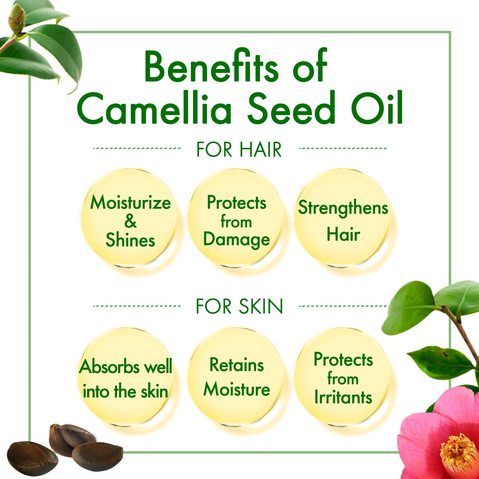 Multi-use oil made with 100% pure camellia seed oil. Suitable for hair, skin, and nail care.