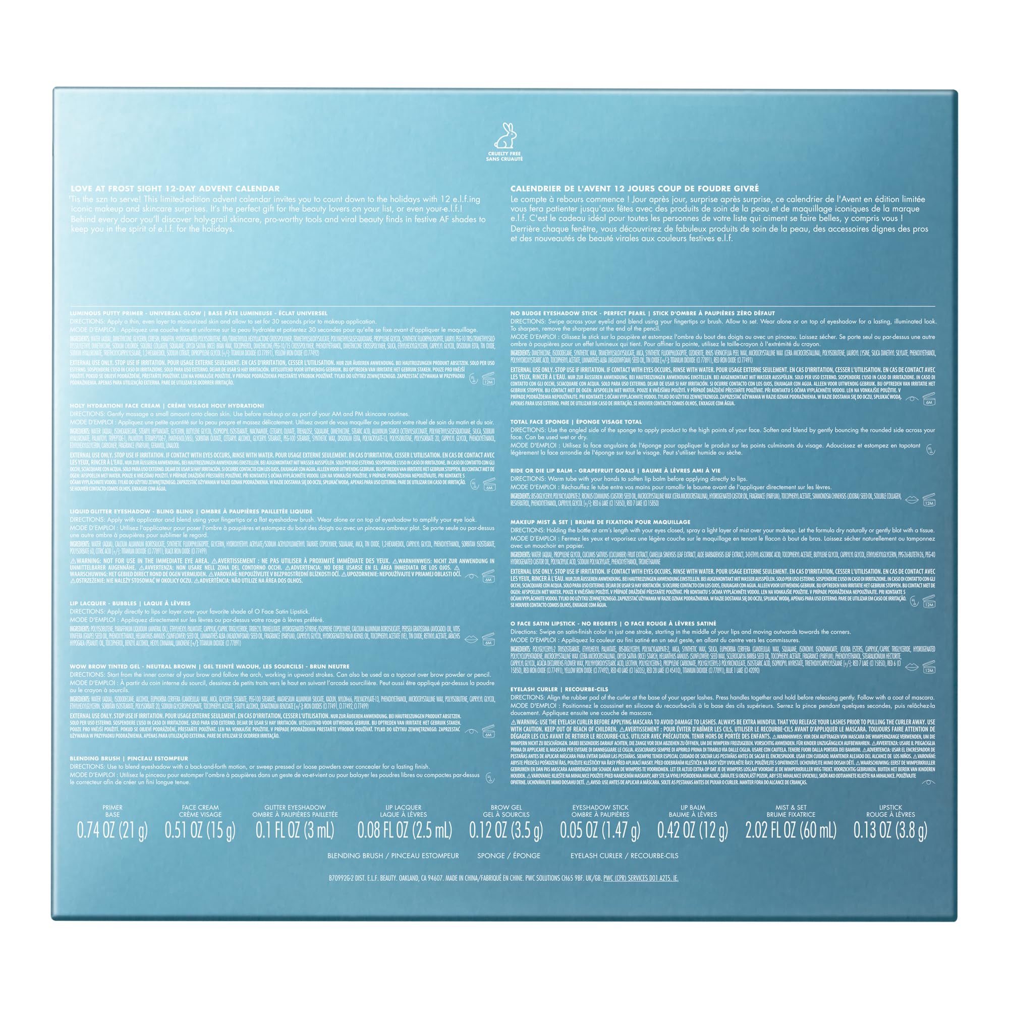 The countdown is on! This holiday beauty advent calendar from e.l.f. Cosmetics invites you to celebrate 12 days of e.l.f.ing amazing makeup and skincare—it’s the perfect gift for the beauty lovers on your list. Behind every door you’ll discover holy-grail skincare essentials, pro-worthy tools, and viral beauty finds in festive shades to keep you in the spirit all season long. What it is: This beauty advent calendar is filled with e.l.f.’s most-wanted makeup and skincare products that will keep you in the spirit all season long. Why you'll love it: Beauty Advent Calendar Includes: 1 Face Primer 1 Skincare Mini 1 Makeup Sponge and 2 Tools/Brushes 3 Lip Products (including two new shades!) 2 Eye Products (including one new shade!) 1 Setting Spray 1 Brow Product Ingredients may change or vary from time to time. Please refer to the packaging of the product received for the list of ingredients in your particular product. All e.l.f. products are proud to be 100% vegan, cruelty-free, and Leaping Bunny Certified. Because kindness is chic.