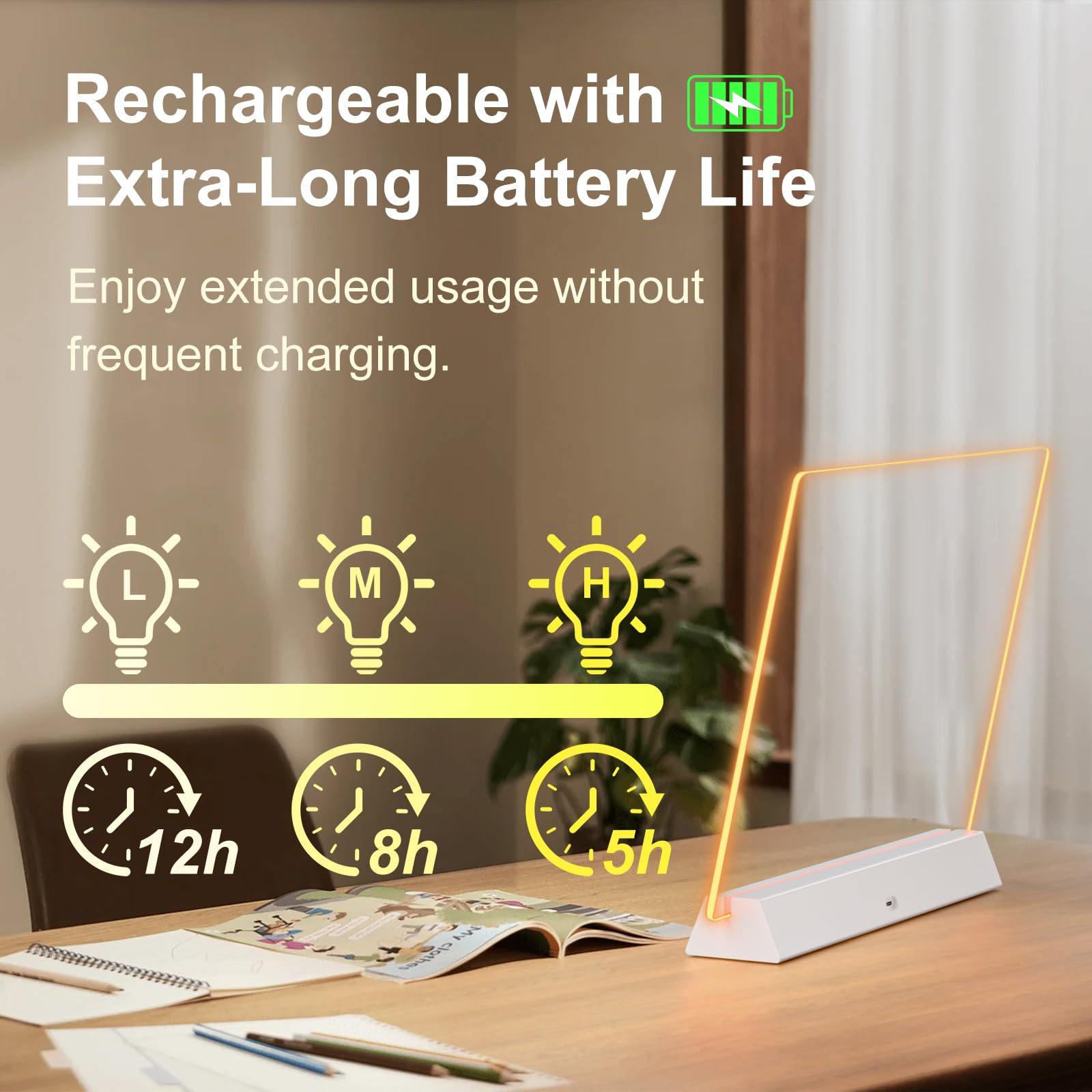 [Rechargeable & Long-Lasting]-: Enjoy cordless convenience with the built-in rechargeable battery base, eliminating the need for constant outlet access or disposable batteries, and providing up to 12 hours of continued illuminated use