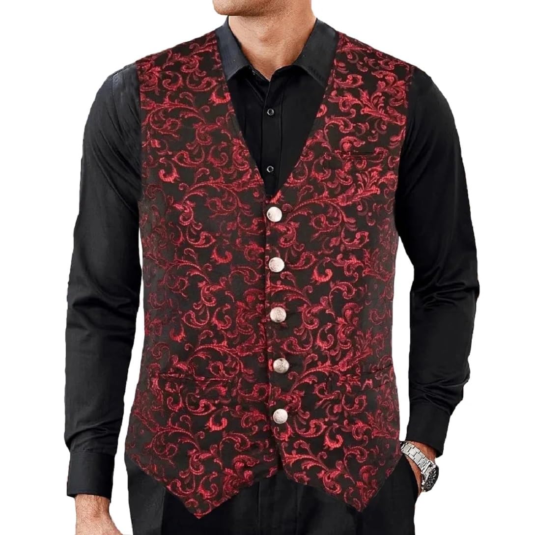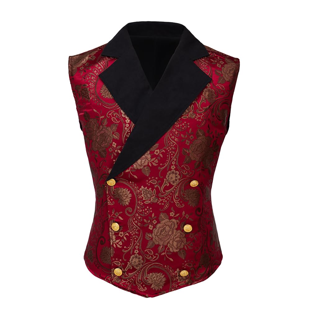 Darkrock Mens Vest Waistcoat Gothic Steampunk Victorian (Red Brocade, 4XL)