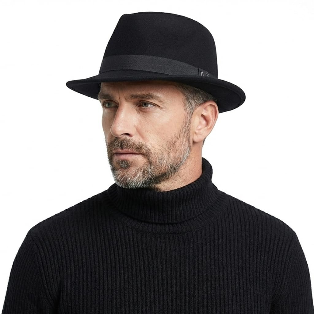 Black Fedora Hat for Men - Classic Wool Short Brim Trilby for Winter, 7 1/4