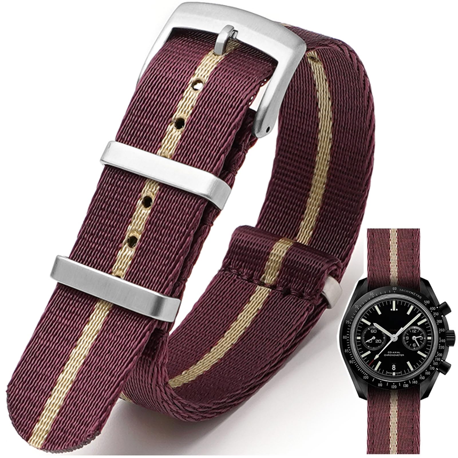 【Premium Material】Our nylon watch band are made of 1.5mm thick premium ballistic woven nylon materials, soft, breathable, lightweight and waterproof. And buckle fabricated from 316L surgical grade stainless steel. Nylon strap is heat sealed and stitched, Neat stitching make the band durable. The surface of the watch band is smooth, feels soft and comfortable. The heavy duty stainless steel buckle is also the latest fashion style, solid and sturdy at the same time.