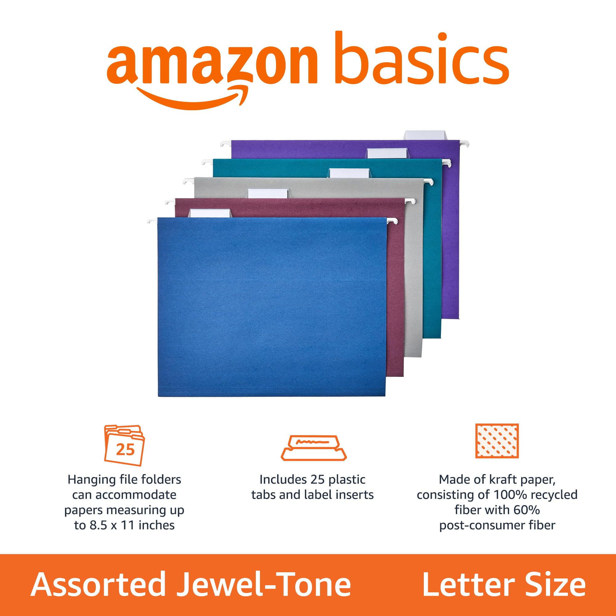 Hanging file folder (25-pack) in Assorted Jewel-tone Colors (Teal, Purple, Gray, Navy, and Burgundy) holds 8.5 x 11-inch letter-size documents and folders