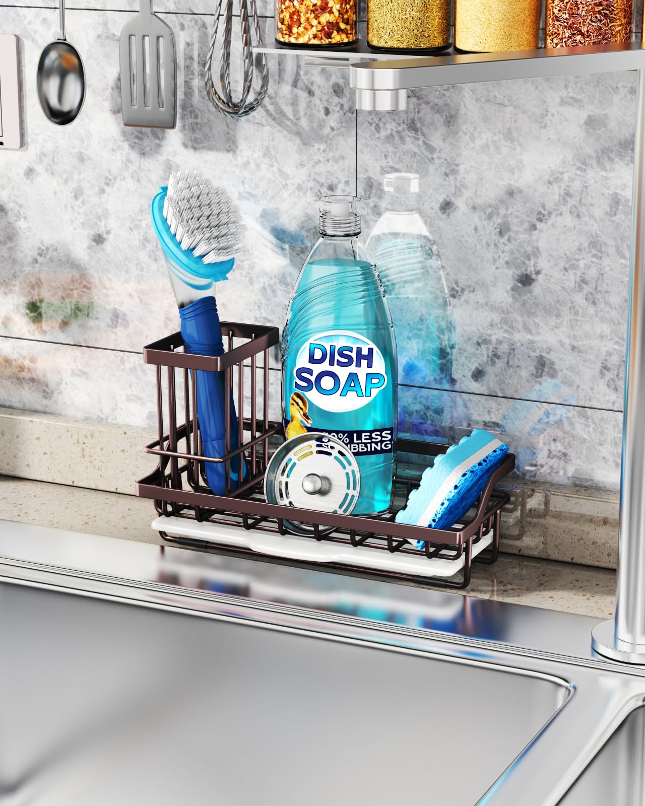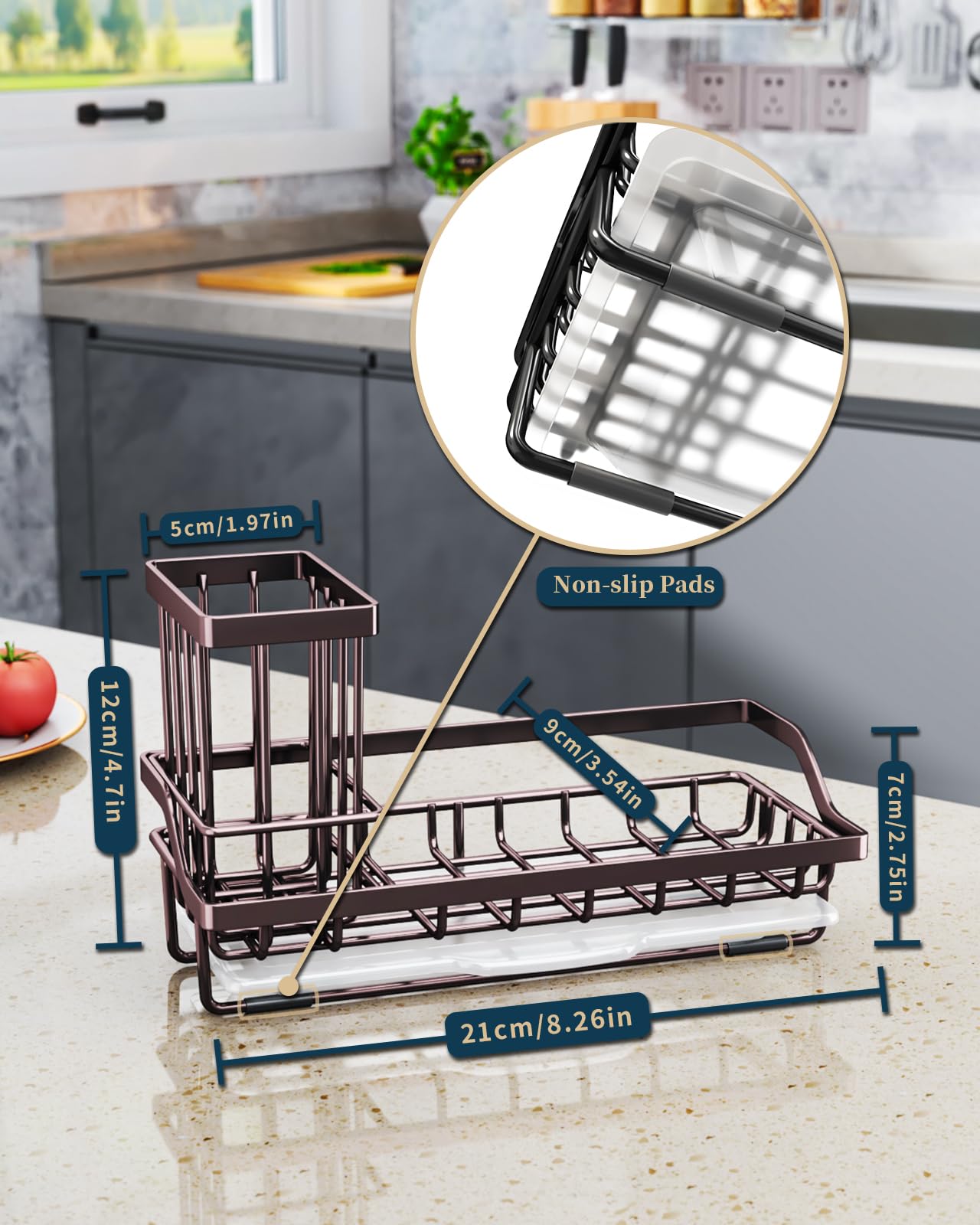 [Counters Tidier - Sponges Drier]: This sponge holder is perfect to organize your sponges, dish soap, brush in one place, make brush upright help them dry quicker. Kitchen sink caddy size is 8.26 * 3.54 * 4.7 in, an excellent helper for sink organization