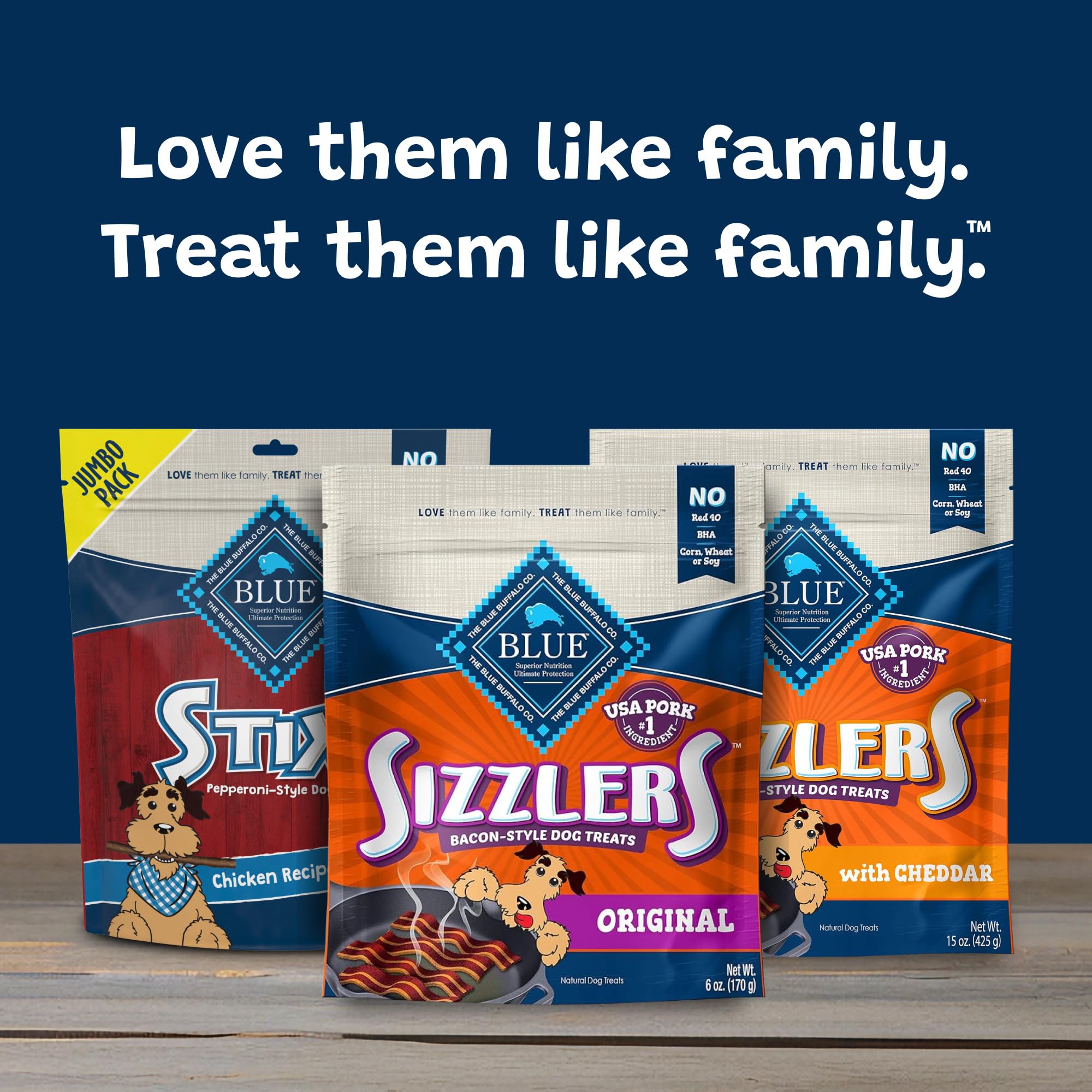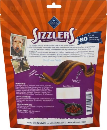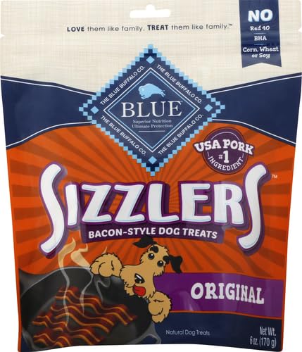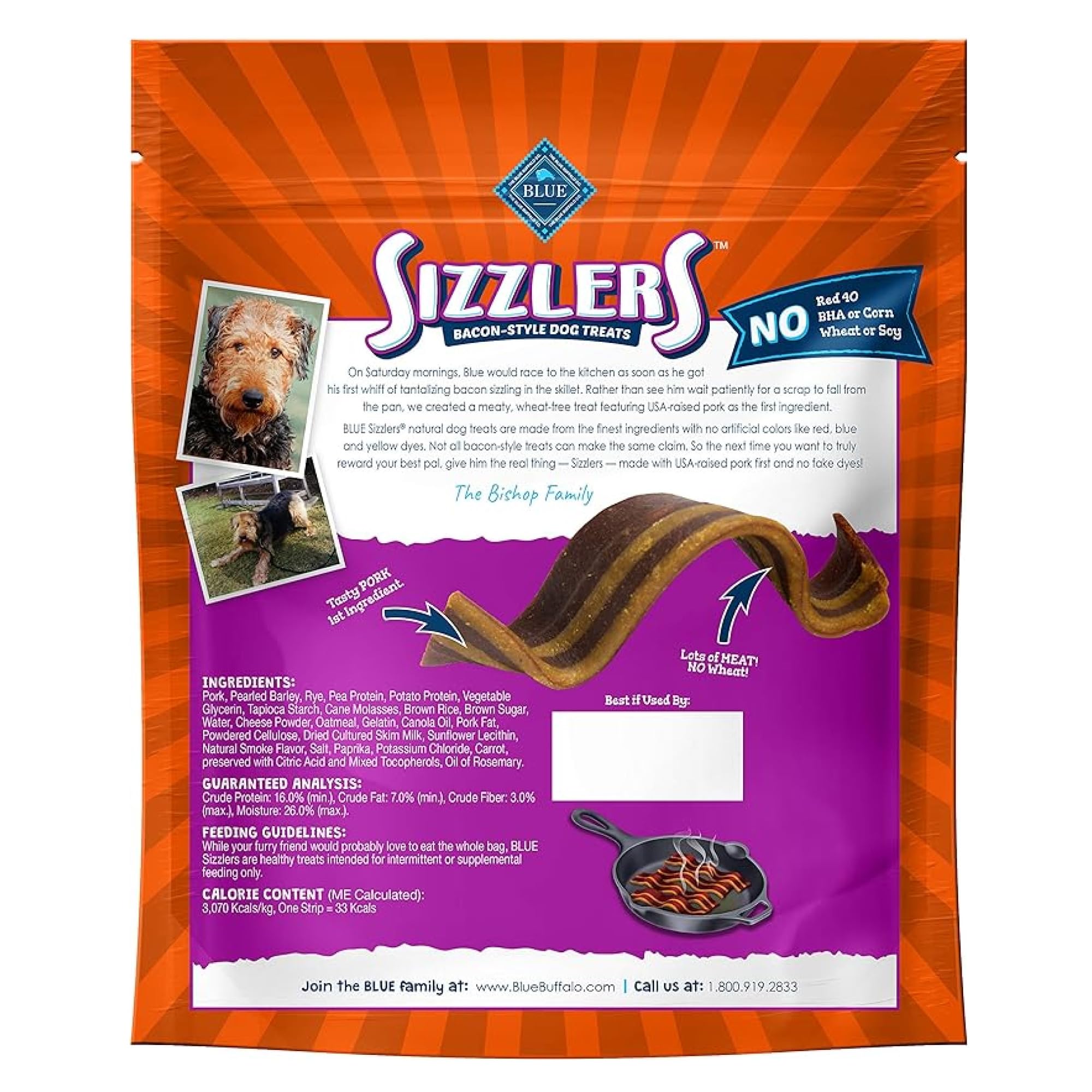 Contains: One 6-oz bags of BLUE Sizzlers Bacon-Style Soft-Moist Dog Treats; Pork Recipe