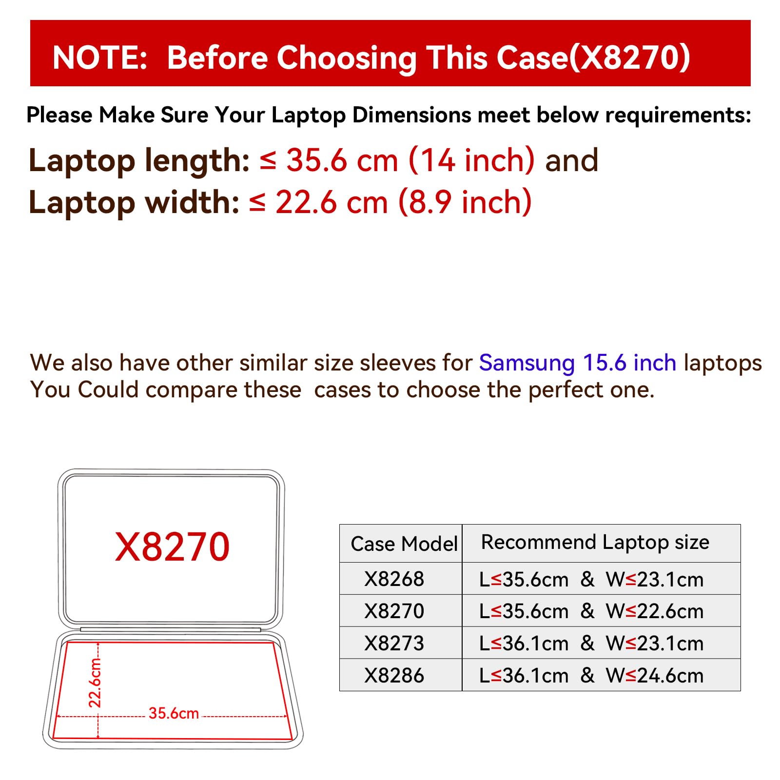 Model No.: X8270: internal dimensions of the case:36.2x22.6x2.7 cm (14.3x8.9x1.1 inch)