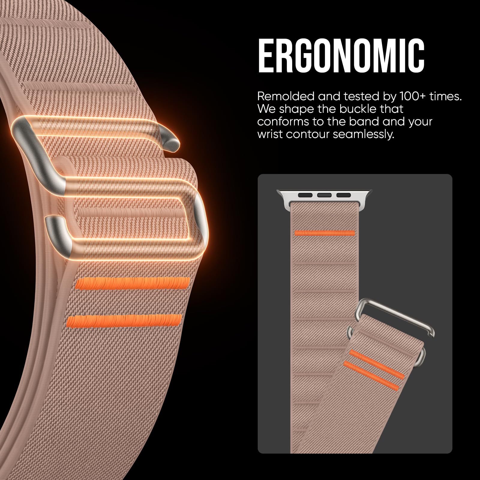 Ergonomic. Your Comfort in Mind: Remolded and tested by 100+ times, the stainless steel buckle finally comes in a perfect S, the ultimate shape that conforms to the apple watch stretch band and your wrist seamlessly, offering a secure, snug fit.