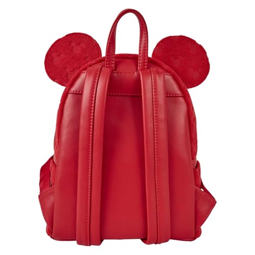 All Mickey all the time! This bag is ready to make a statement with you while keeping your essentials safe! This red mini backpack is made of faux leather and terry cloth. Mickey head silhouettes are "burned out" in the material to create an all-over pattern on the bag. This is a great accessory for any Disney fan that wants a little more Disney magic in their life.