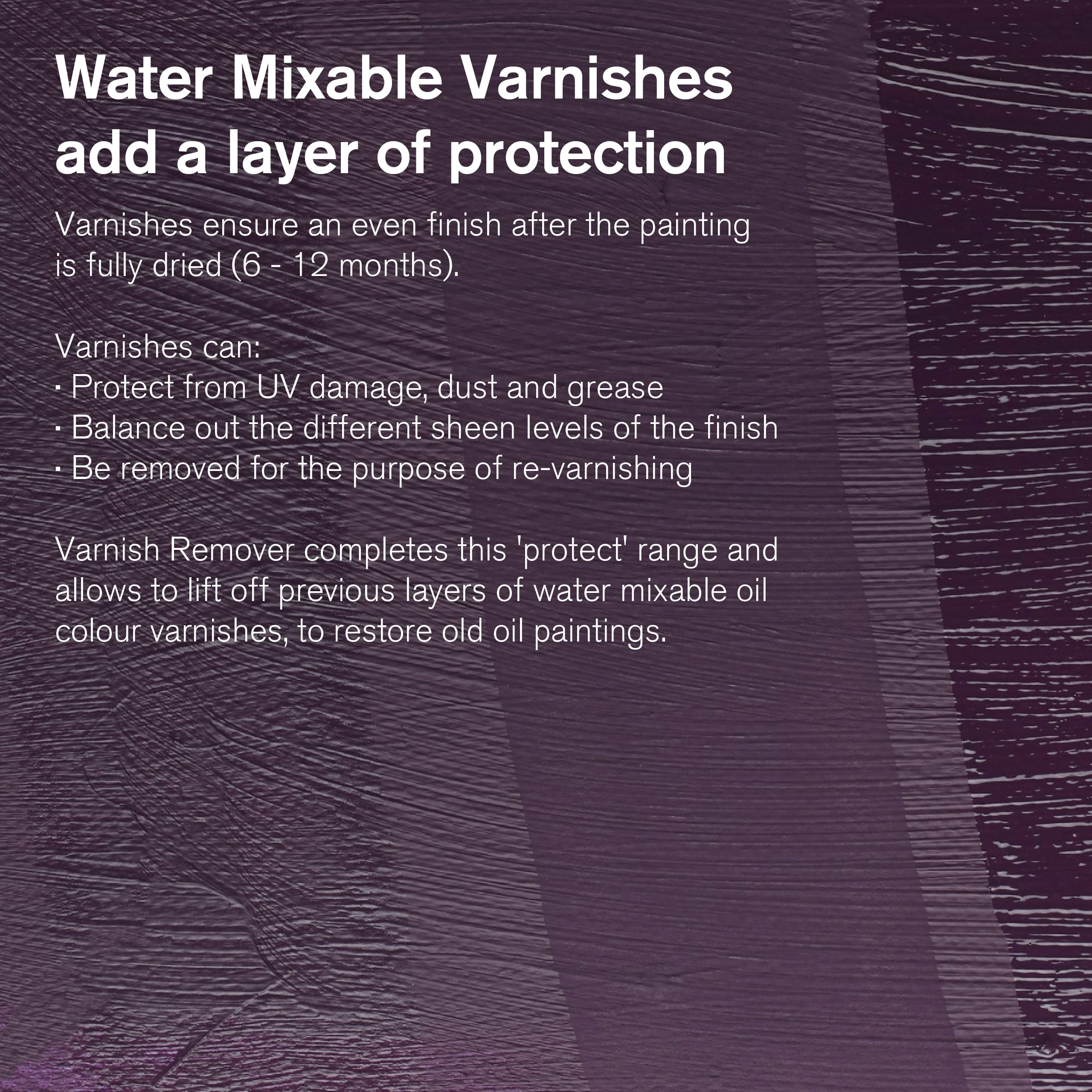 Winsor & Newton Artisan Water Mixable Mediums, Varnish Remover safely removes Artisan varnishes from paintings for cleaning & re-varnishing. Apply generously onto a lint free cloth and gently rub into the varnish film. If slight pigment is visible on the cloth this is an indication that the removal has been successful. Avoid undue abrasion.