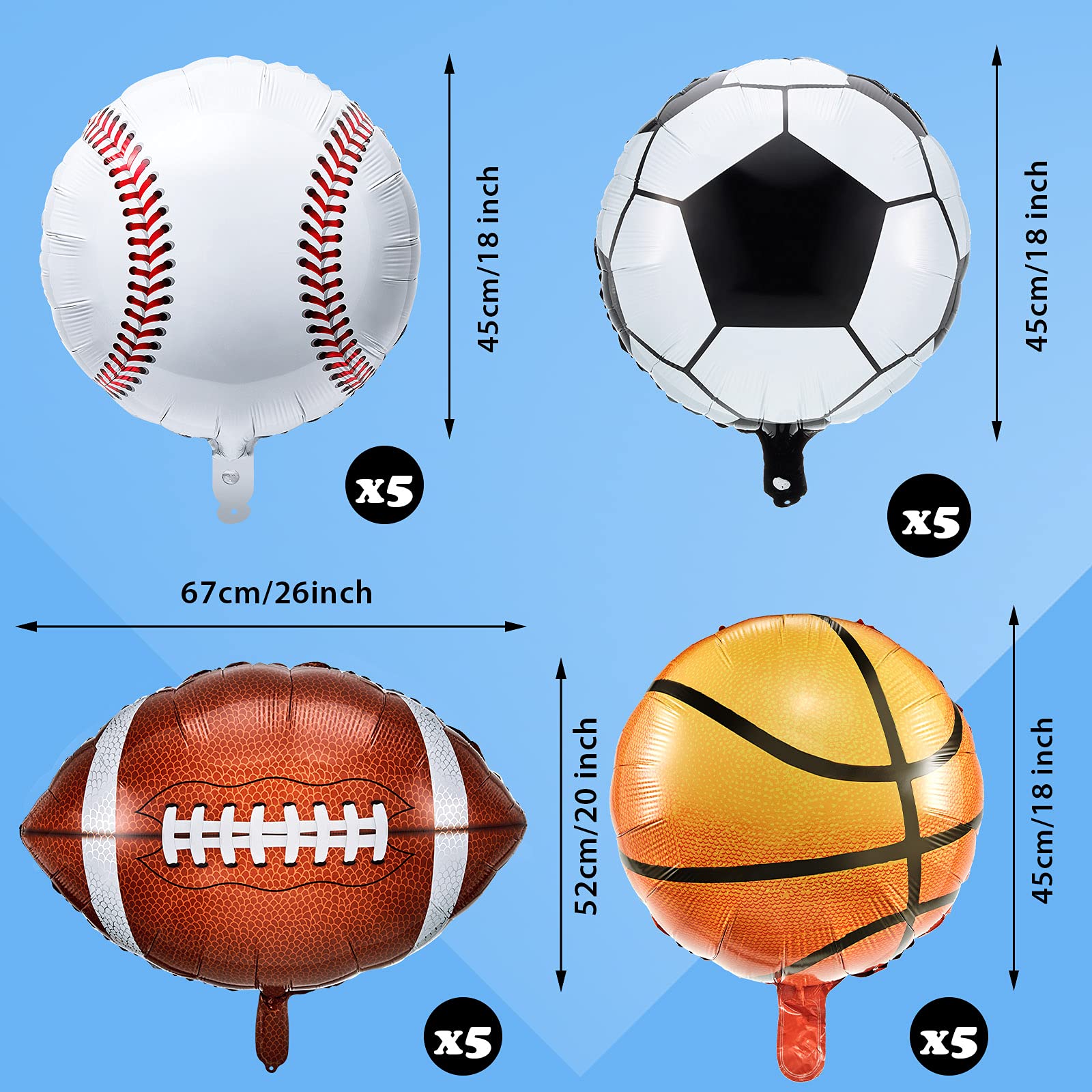 Sports game theme: our metallic foil balloons are well designed as sports game theme with simulated shapes, which restore the shape of football, basketball, baseball, and soccer to the largest extent, it will instantly make a party come to life and will be loved by all ball games lovers