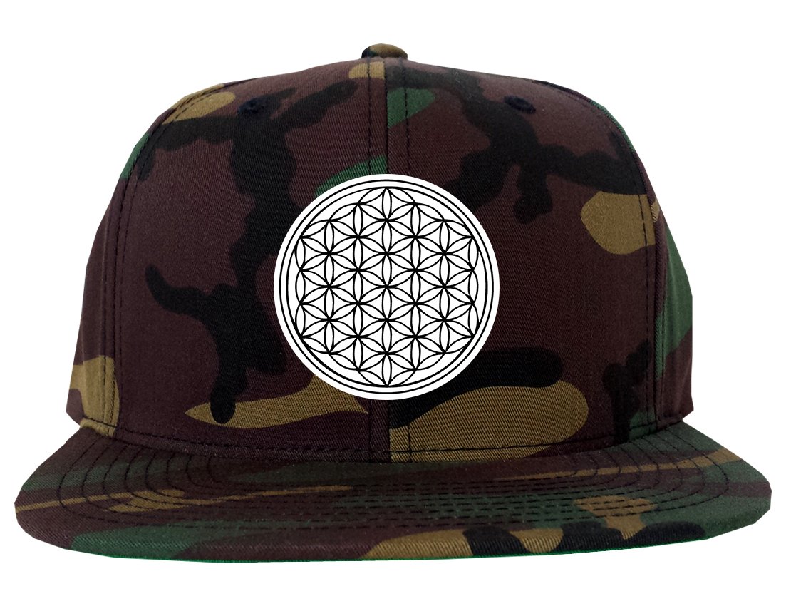PRODUCT: Our Flower Of Life Chest Mens Snapback Hat Cap Army Camouflage Camo is a classic style basbeball cap with a flat brim featuring a unique graphic print design on front by clothing brand KINGS OF NY.