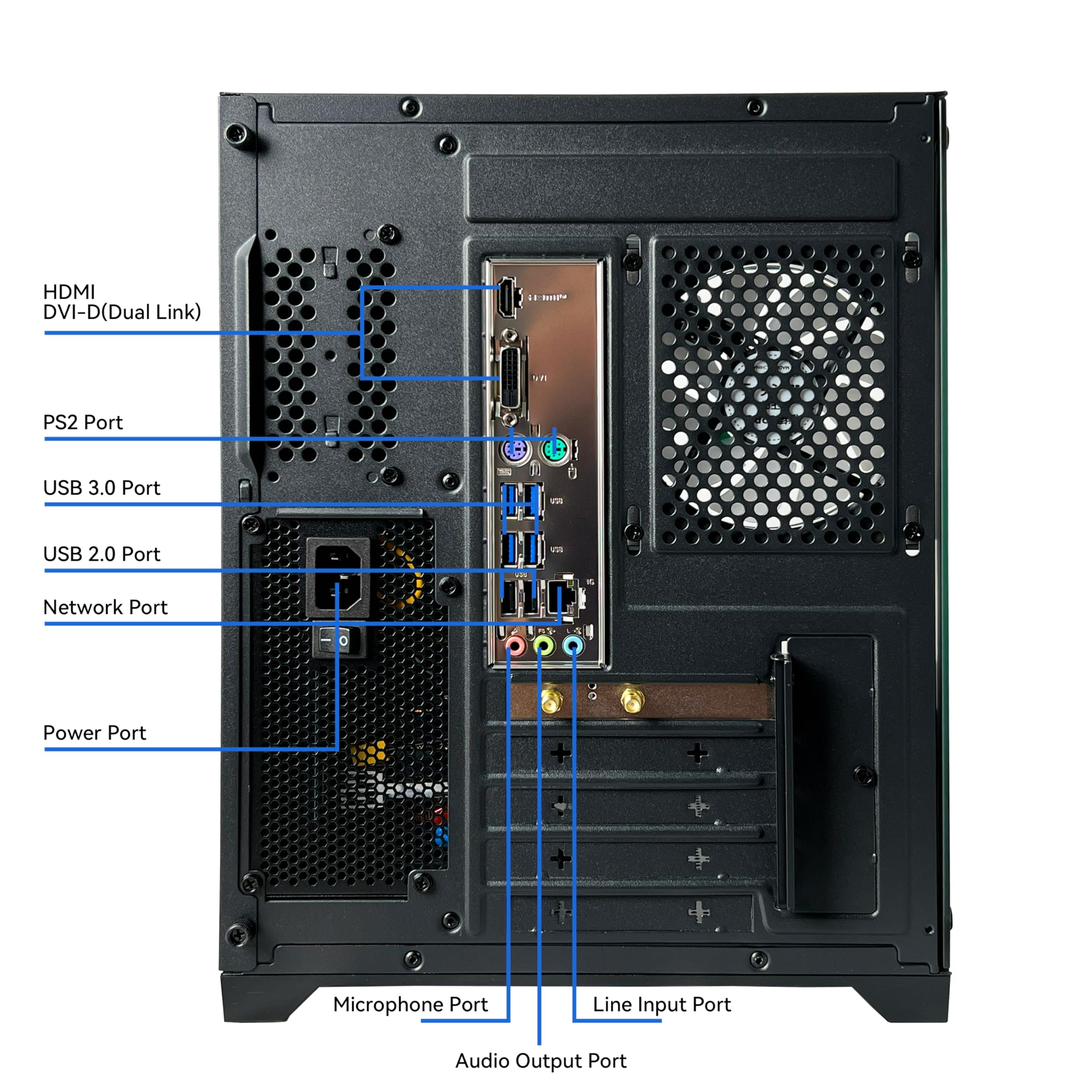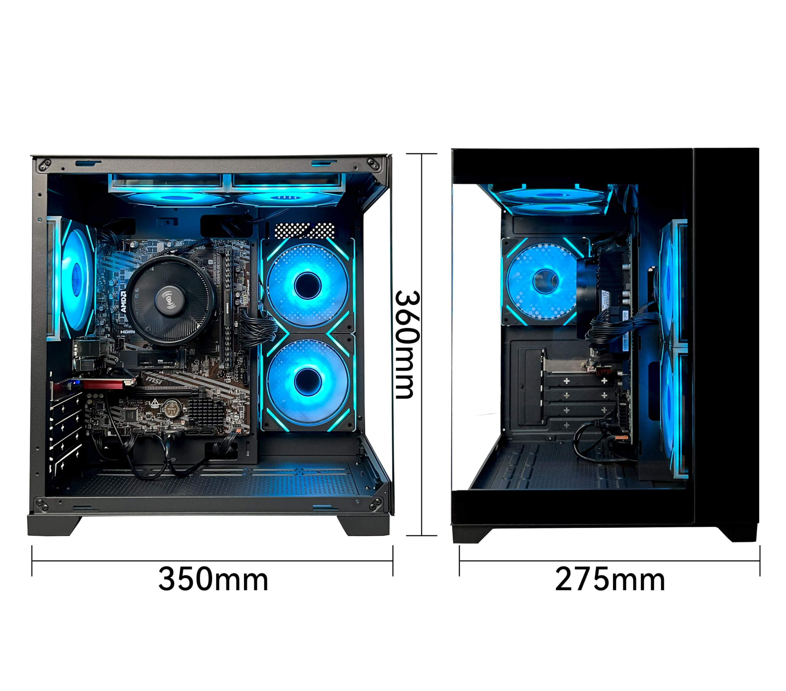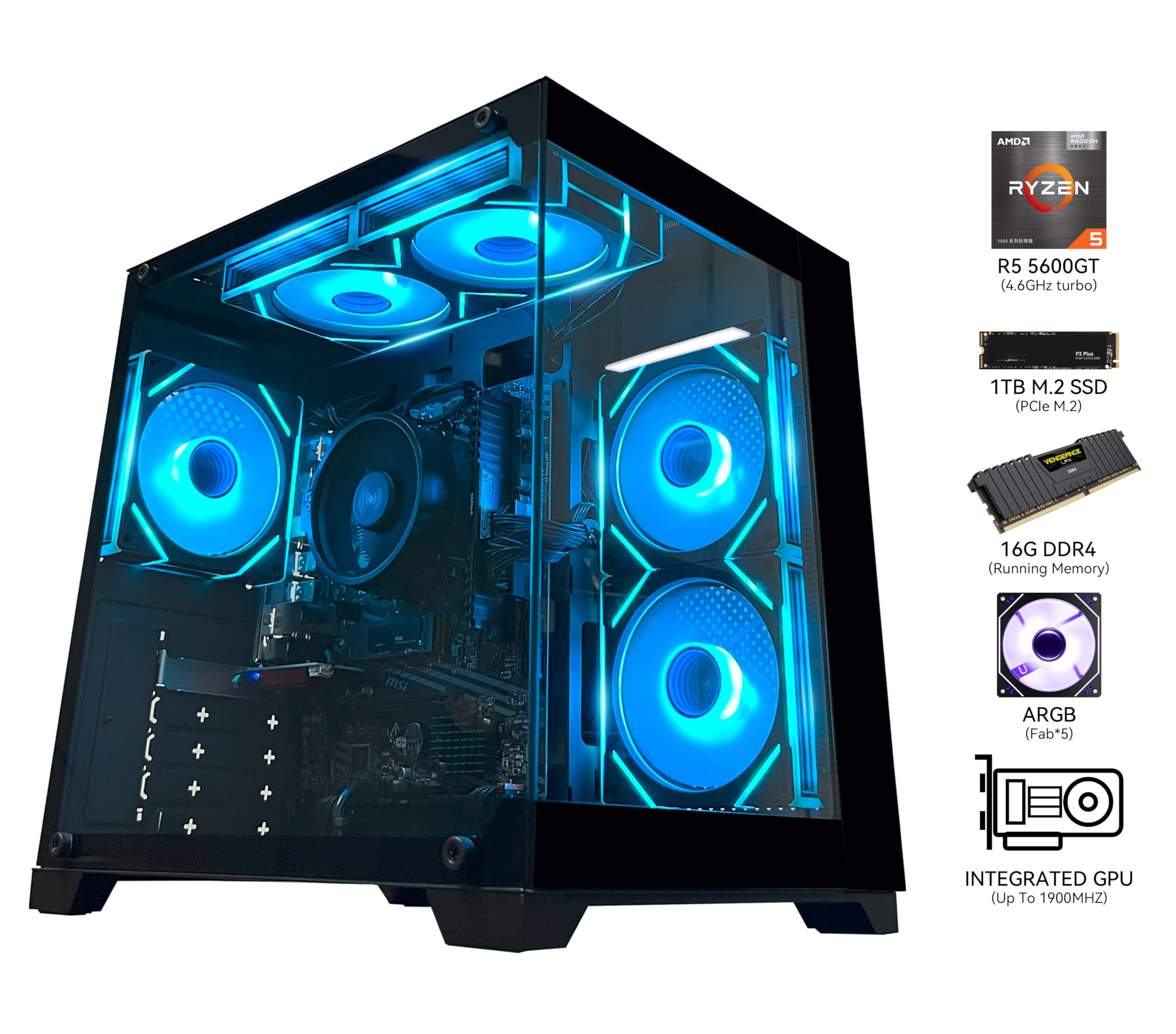 Cooler: AMD air cooling + 5 X 12cm ARGB FANS ensure low noise and sufficient heat dissipation Fan: Configure 5 ARGB fans, intelligent temperature control mute (with remote control) Wireless: Antenna WiFi+BT