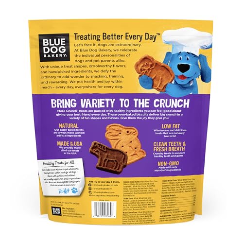 More Crunch treats are packed with healthy ingredients you can feel good about giving your best friend every day. These oven-baked biscuits deliver big crunch in a variety of fun shapes and flavors. Give them the joy they give you. Blue Dog Bakery bakery-fresh More Flavors include their original Peanut Butter & Molasses, Natural Cheese, Grilled Chicken, and Bacon & Cheese flavors. These treats are made with natural whole wheat, real eggs, and nonfat milk, which make them low-fat and easy to digest. While we trust our office dogs’ tail wags as positive indicators of good taste, we also personally taste-test all of our products before they go to market. Made with no additives or preservatives, you can rest easy knowing your dog is getting the best treat that all-natural ingredients can bake.