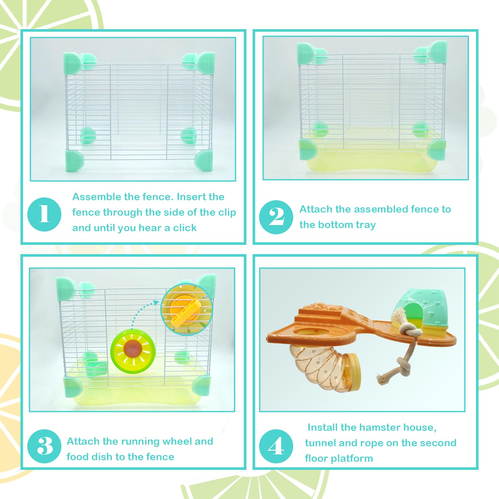 Product include:Dwarf hamster cage is equipped with 1 x Pcs exercise wheel,1 x Pcs tunnels,1 x Pcs water bottle,1 x Pcs food bowl to provide enough room to move around and meet the daily routine of hamster life