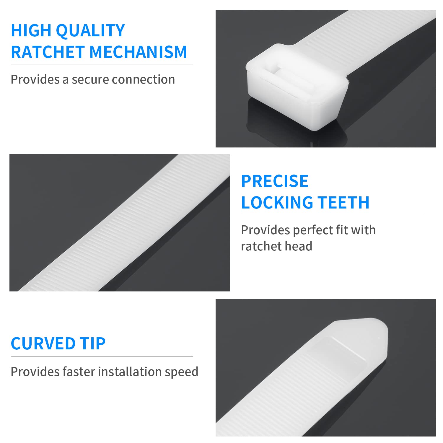 【Easy-Using Desgin】The clear zip ties tail curves to ensure easy head insertion and smooth edges for quick and smooth tightening. The teeth are not returned while fixing the self-locking, which can better fix the thing.