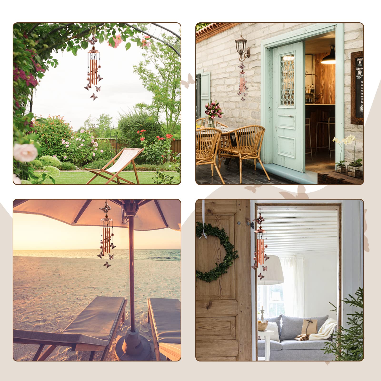 UNIQUE DESIGN: This butterfly wind chimes for outdoors is purely handmade. It contains a large butterfly at the top, 6 small butterflies, 6 small bells, 4 rose gold durable and corrosion resistant aluminum tubes and 1 brass cap. A black nylon cord connects them together to form an elegant wind chime. Silver "S" shaped hooks allow you to hang the wind chimes on your patio or anywhere you wish.