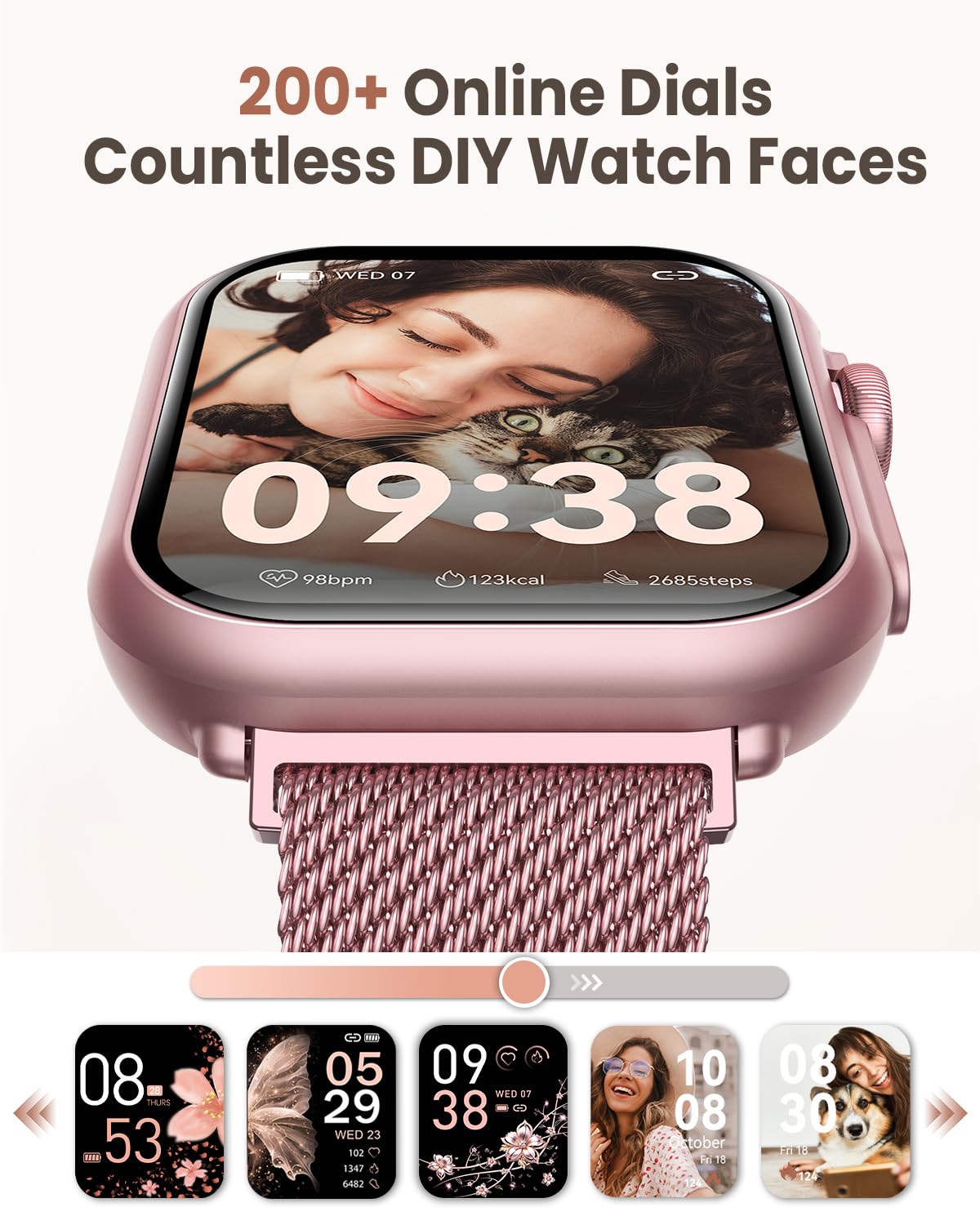 Elegant Smart Watches for Women: This smartwatch comes with a blush pink metal frame and a 1.83" HD screen, which is elegant and stylish overall. 2 different styles of watch bands (1 metal, 1 silicone) are perfect for work, casual wear and special occasions. In addition, there are more than 200 watch face styles to choose from, and you can also upload photos to customize your unique watch face