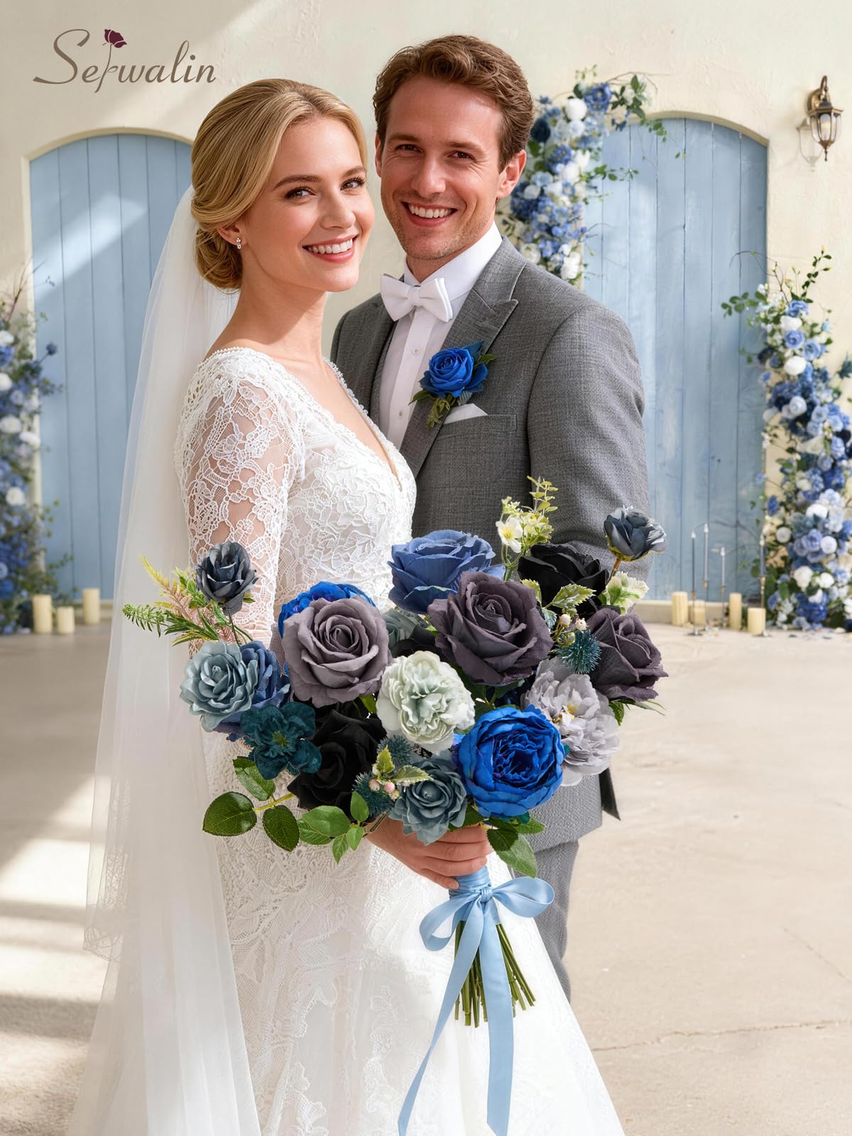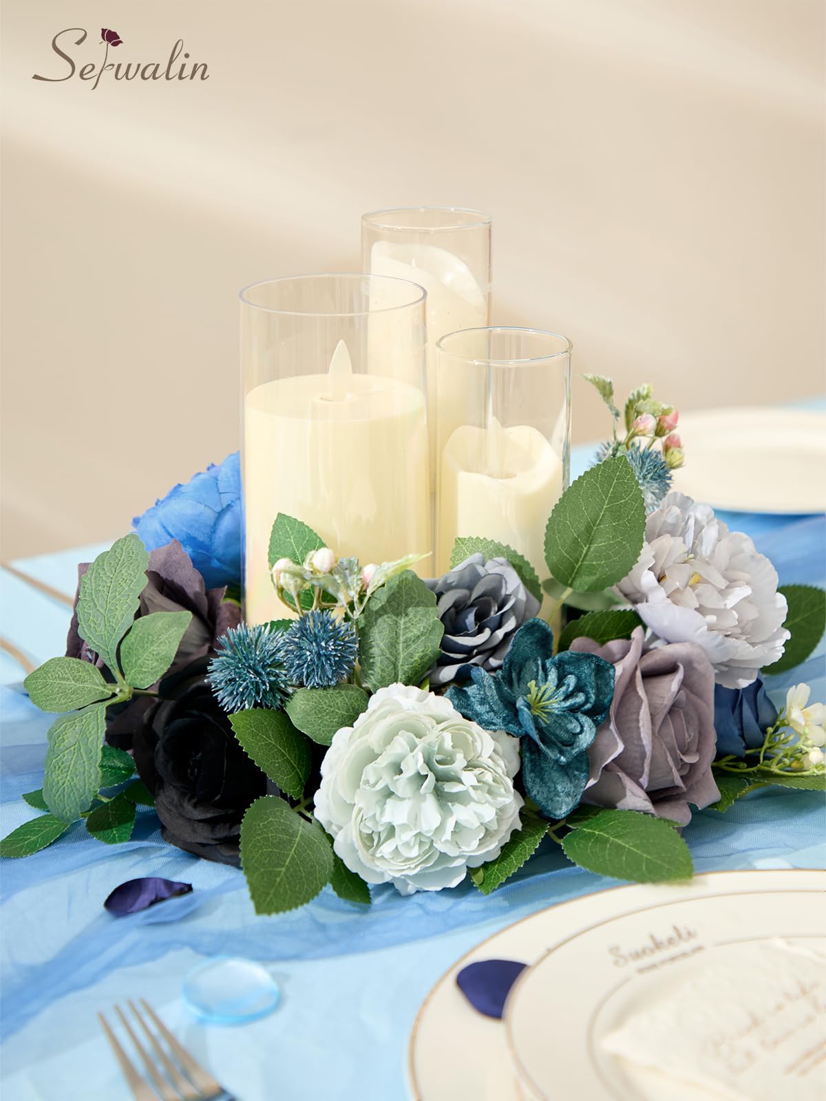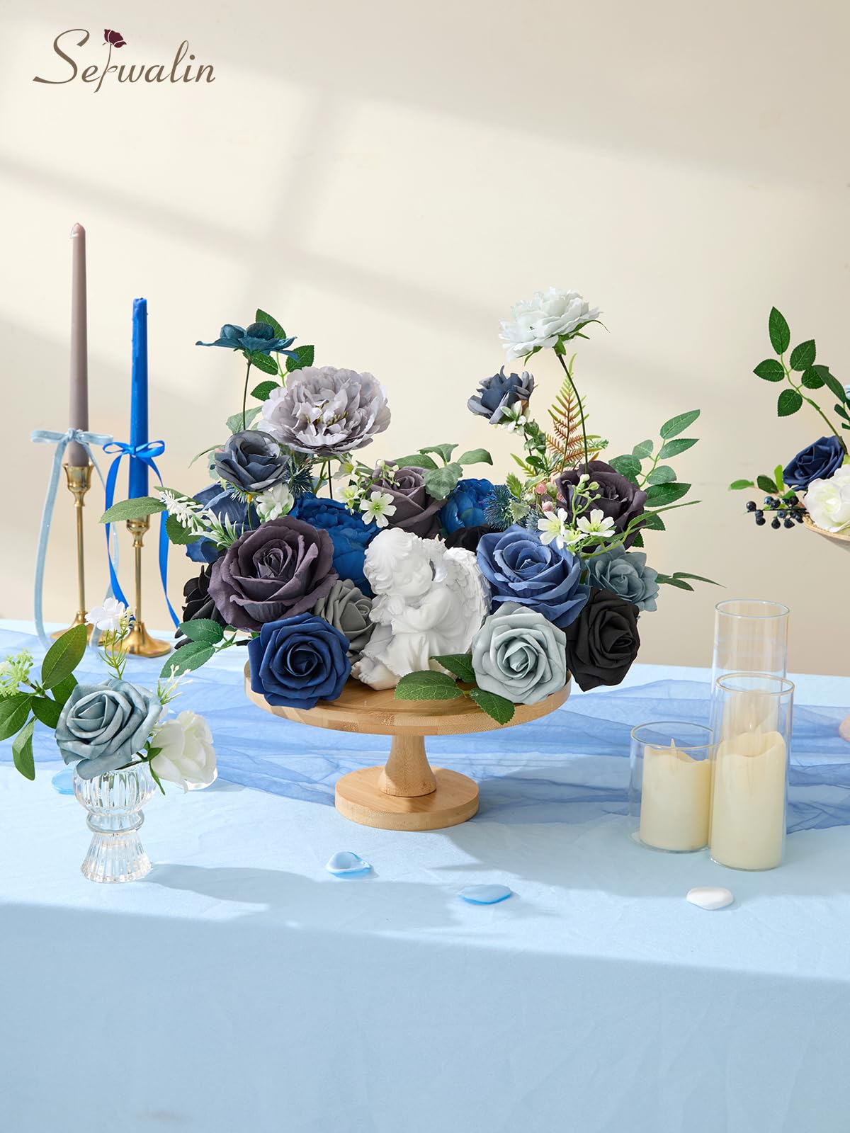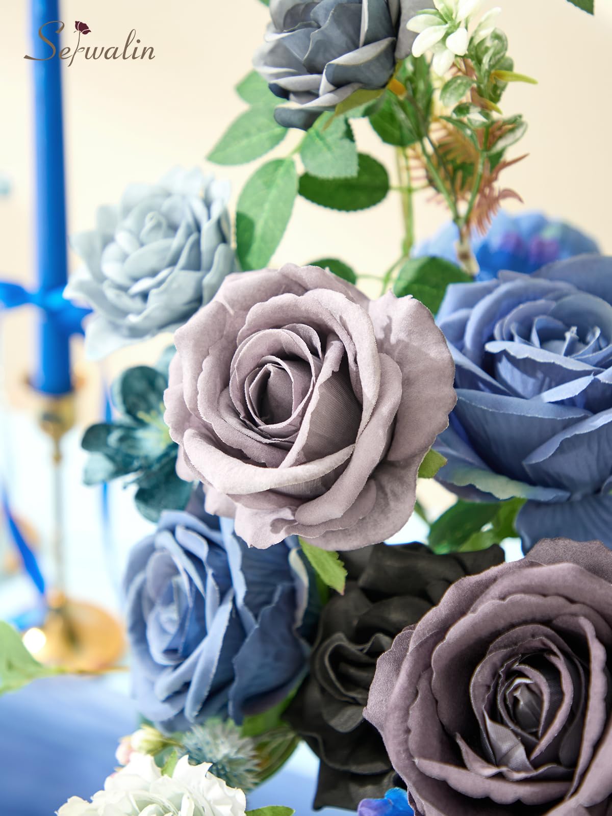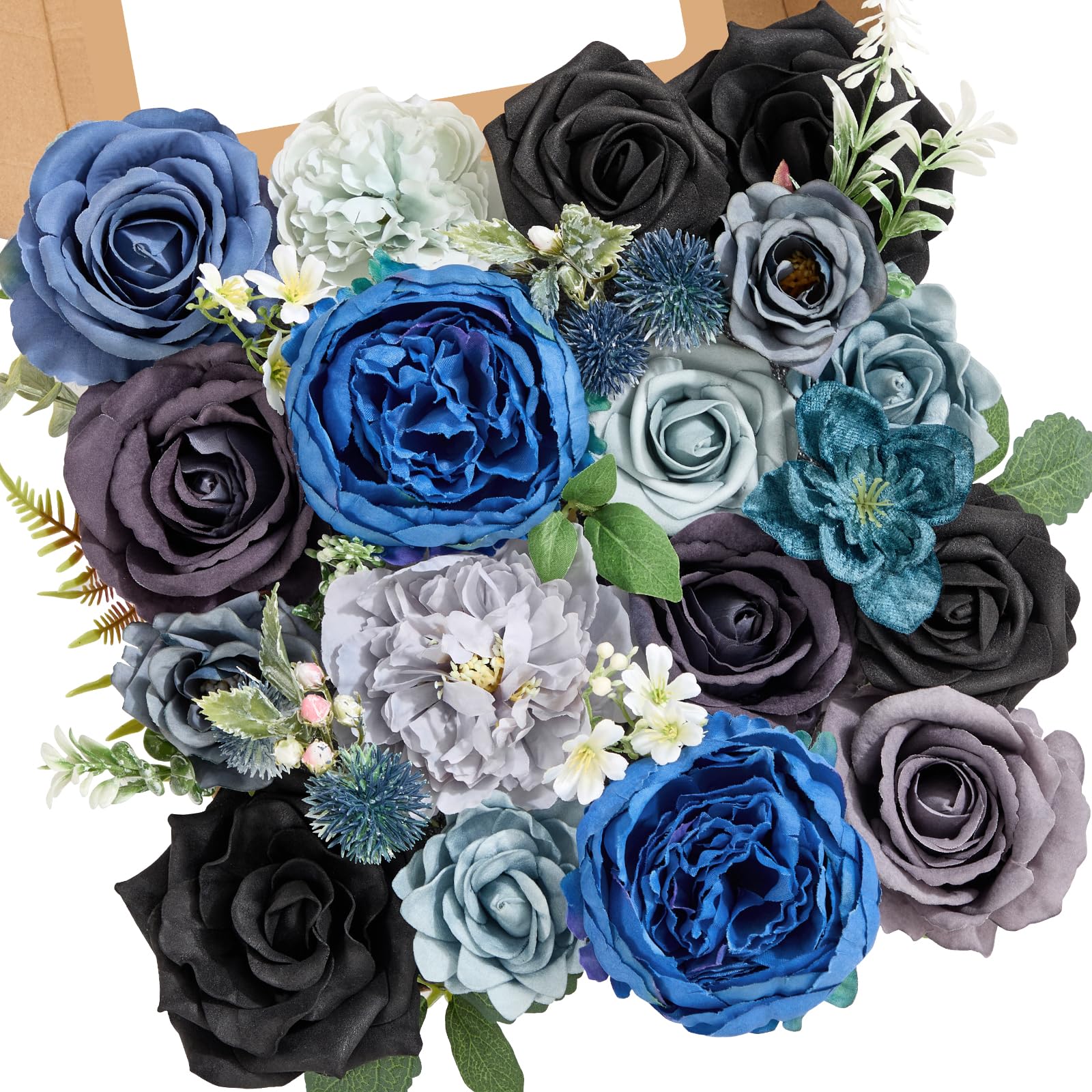 【Artificial Flowers Design】: The artificial flowers' main color scheme is a sophisticated blend of deep navy, slate blue, and charcoal black, creating a moody and elegant aesthetic. The arrangement features a diverse mix of textures, from the silky, multi-layered petals of blooming peonies to the velvety finish of classic roses